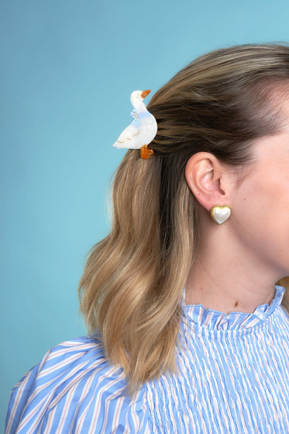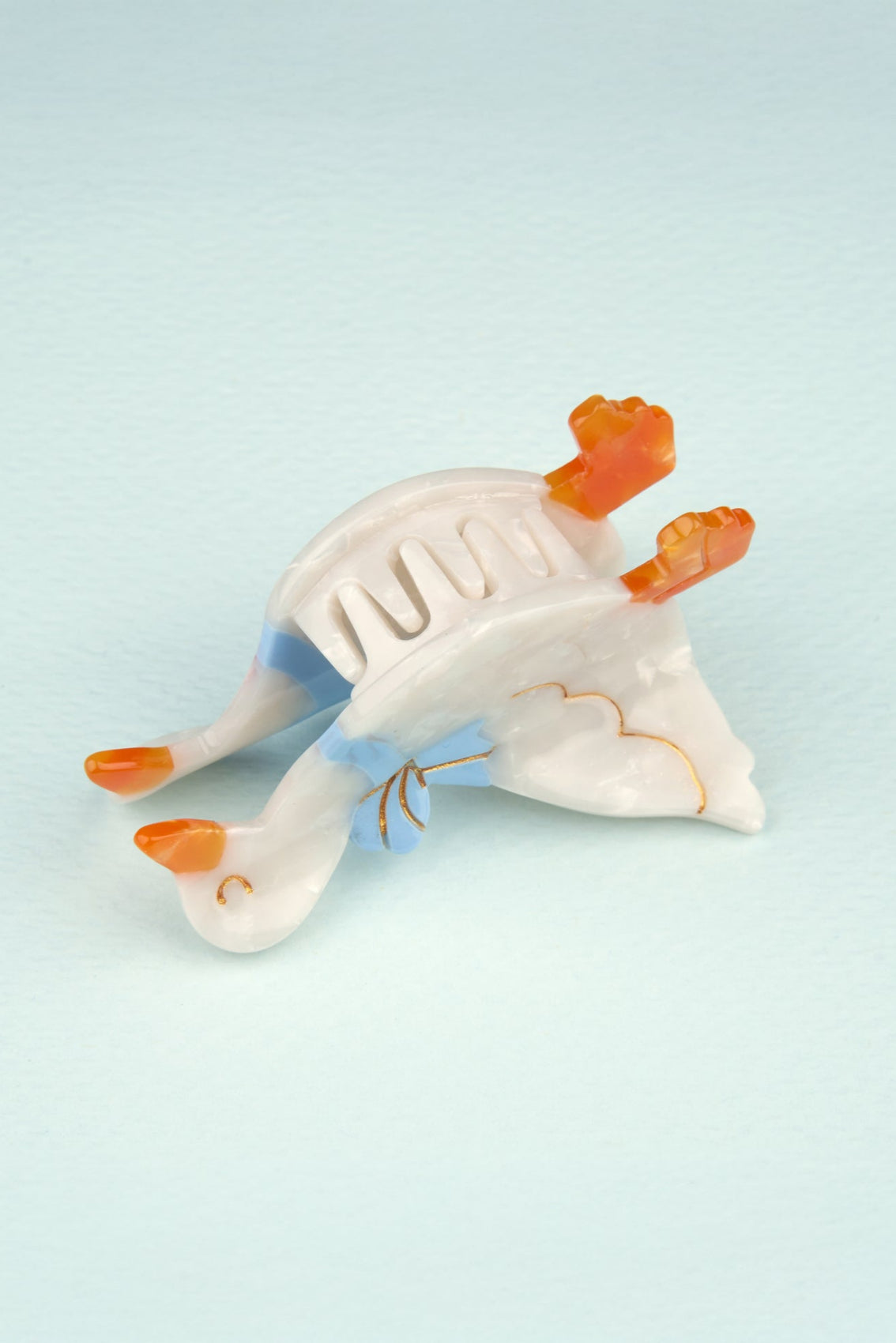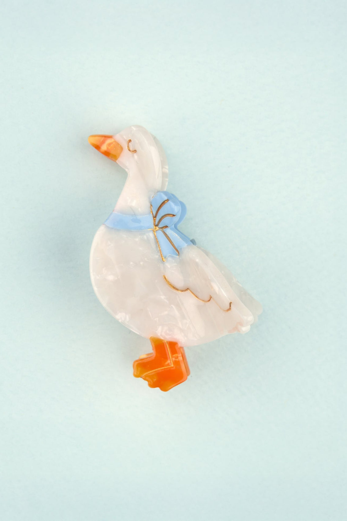 Une mignonne petite oie à la recherche d’une chevelure pour y faire son nid. On craque pour cette mini pince à cheveux régressive et cet oiseau au plumage nacré, fièrement décoré d’un ruban bleu ciel. Le plus original des accessoires pour décorer tous nos chignons !