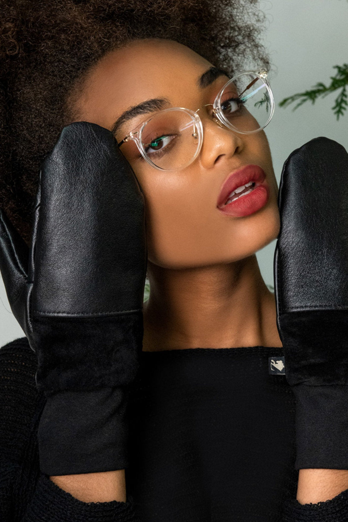 Paire de mitaines faites en cuir et suède recyclés, avec poignets en rib.