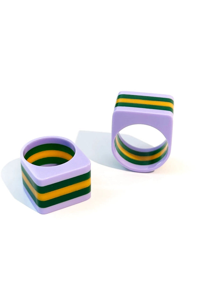 Découvrez la bague SLAB - présentant des couleurs audacieuses superposées dans des designs saisissants et uniques en leur genre. Chacune est méticuleusement fabriquée à la main en acrylique en très petites séries, les rendant aussi uniques que la personne qui les porte.