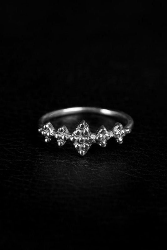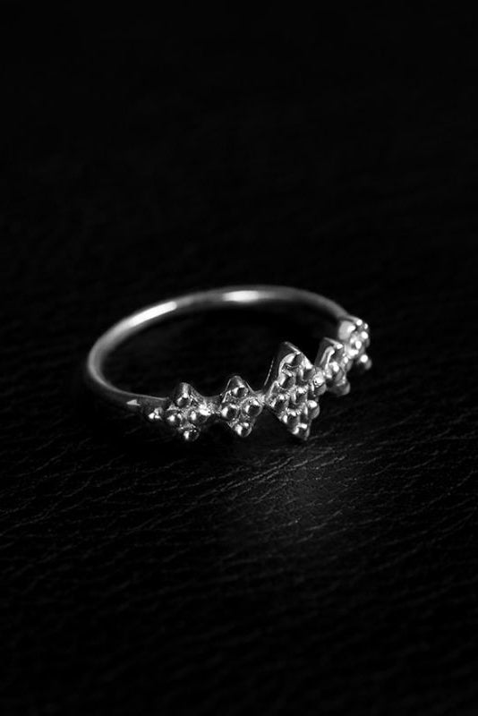 Avec son ornementation en forme de diamant, cette bague capture une énergie lumineuse, semblable à celle du ciel. La granulation ajoute de la profondeur et de la texture, s'inspirant du pont subtil entre héritage et modernité.