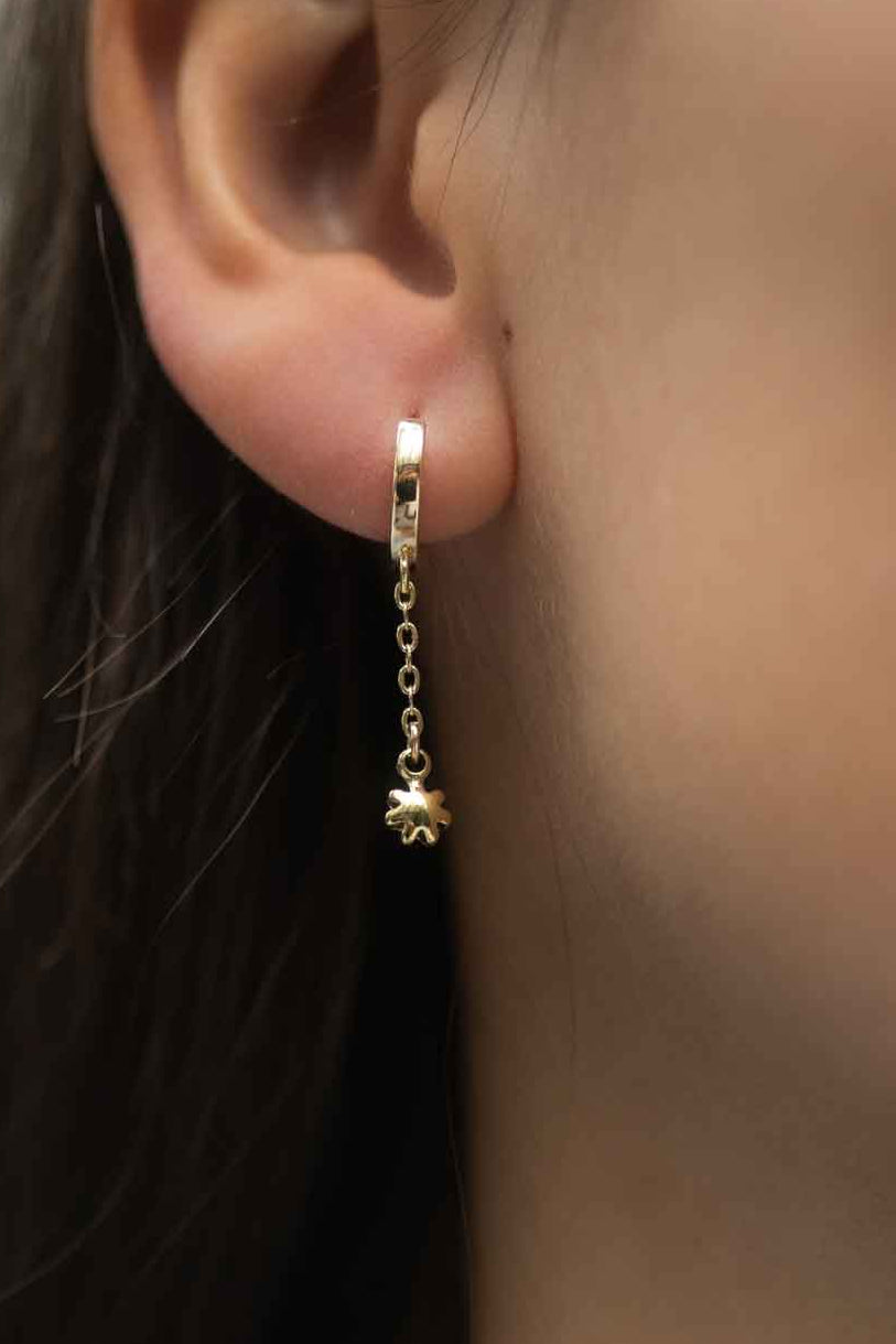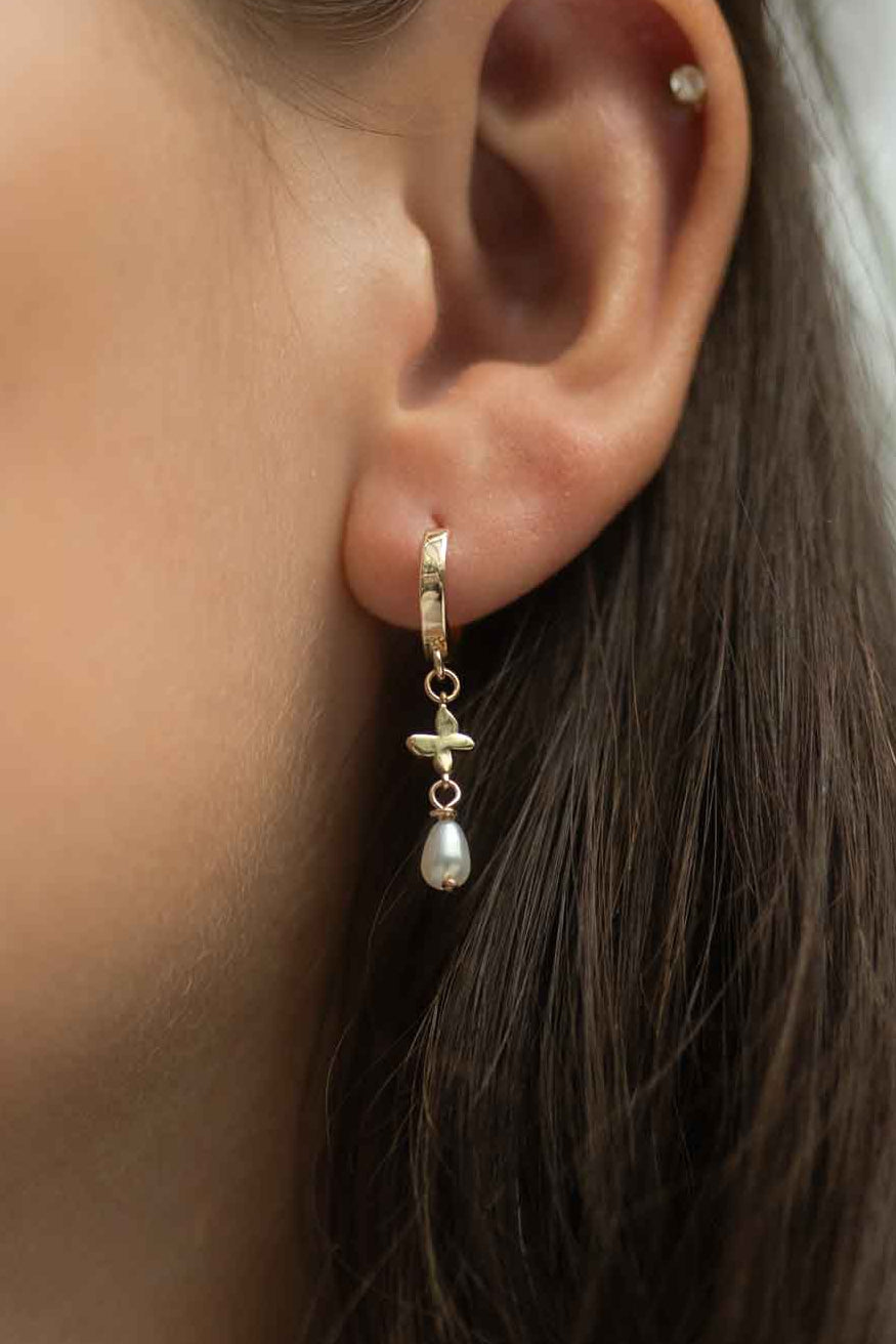 Boucles d'oreilles asymétriques délicates ornées d'un minuscule papillon et d'une fleur, d'une perle d'eau douce et d'une chaîne en plaqué or 14 carats. Montées sur des boucles d'oreilles confortables à fermeture facile, plaquées or.