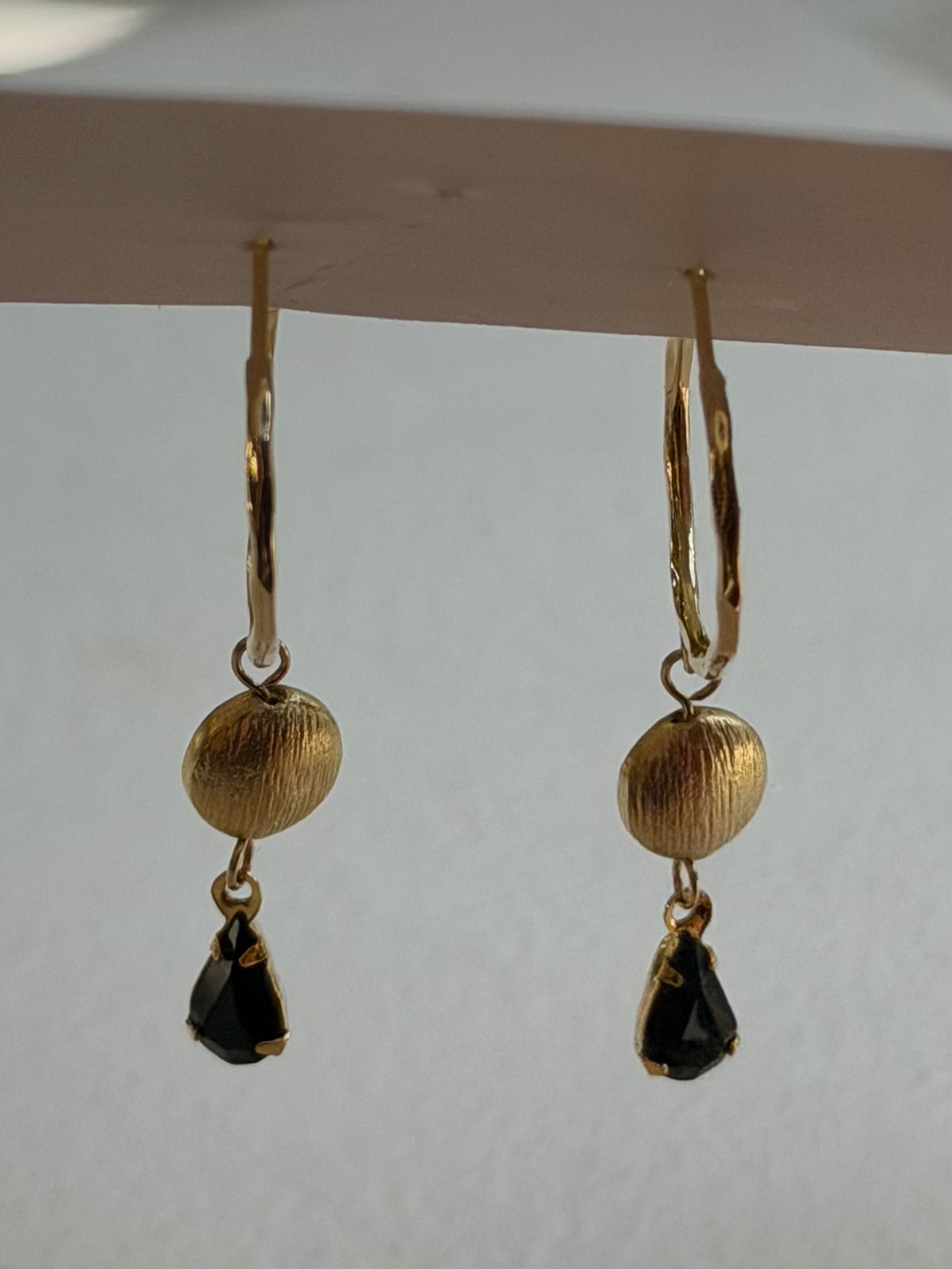 Anneaux martelés sur tiges au style contemporain. Avec billes dorées au fini brossé et pendentifs de verre. Plaqué or.