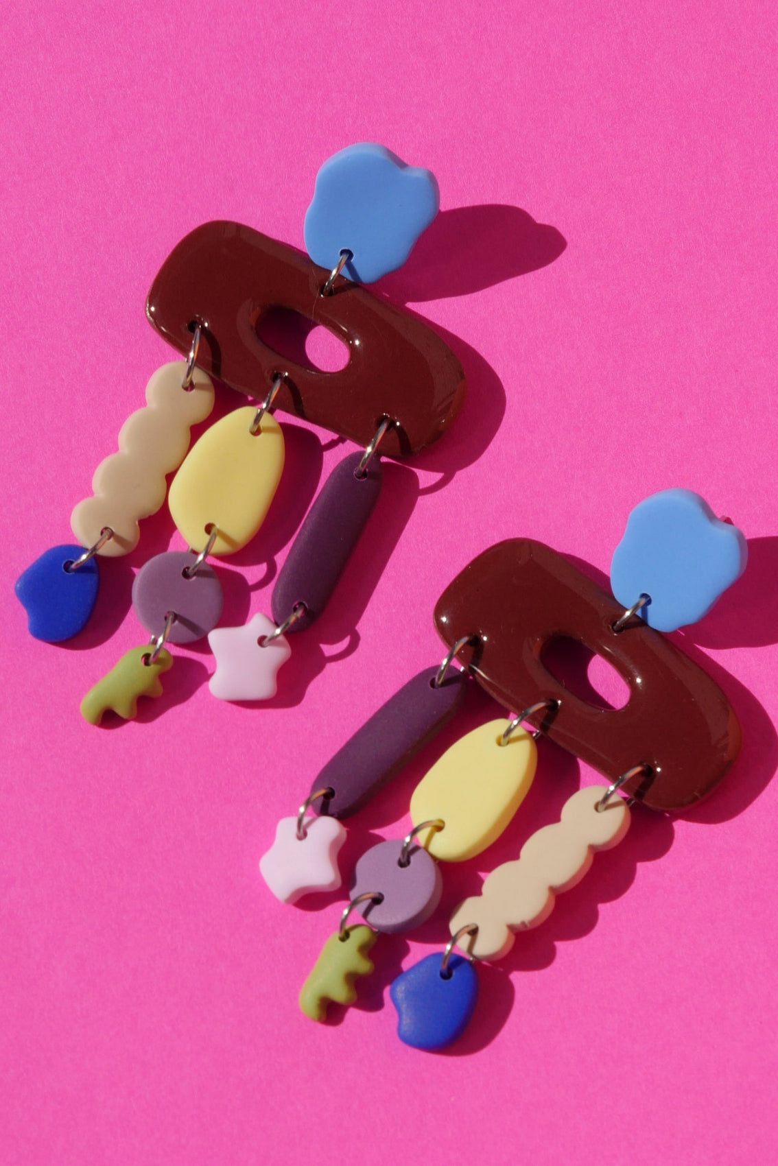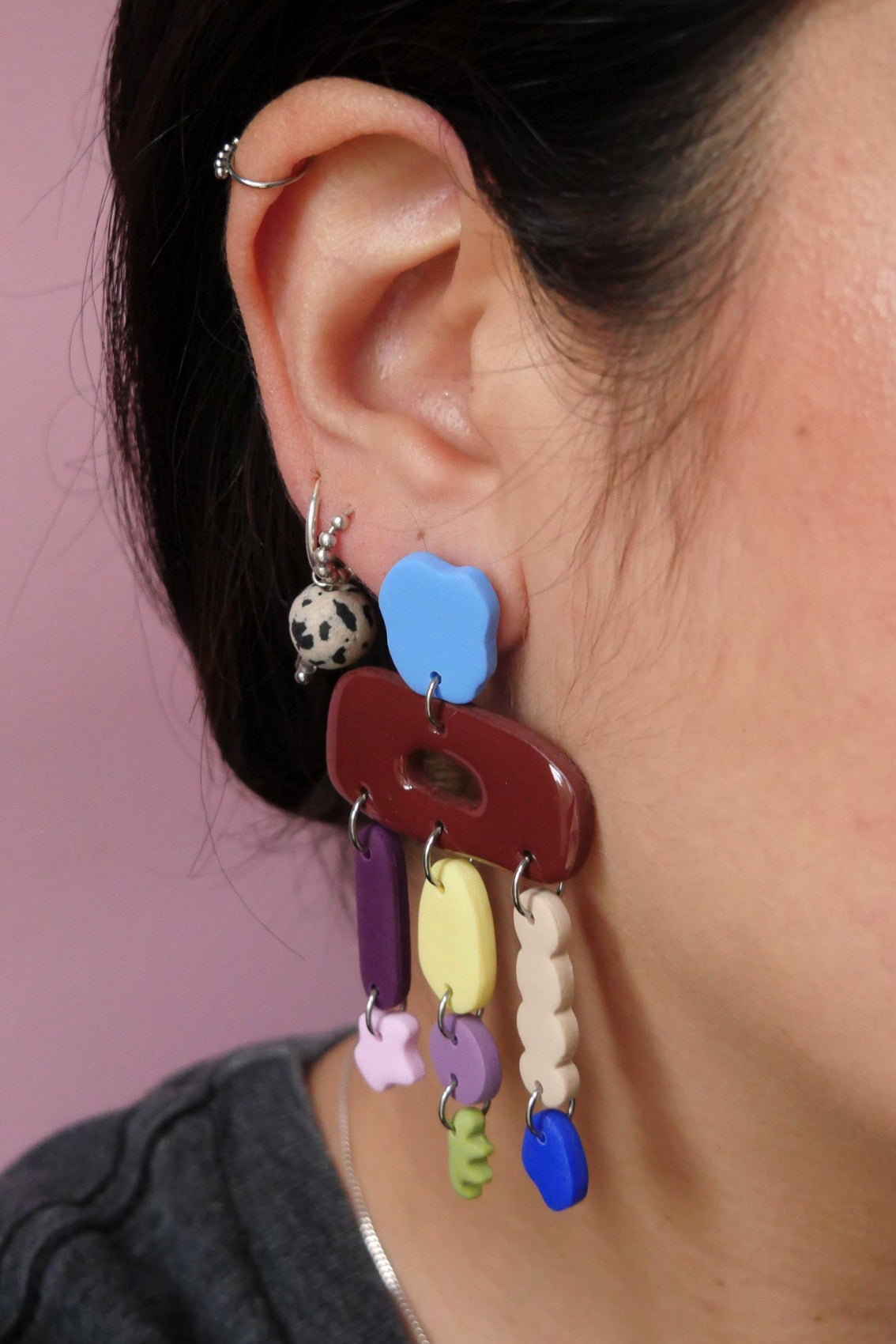Boucles d'oreilles en argile polymère façonnées avec soin à la main, dans son atelier à Montréal.