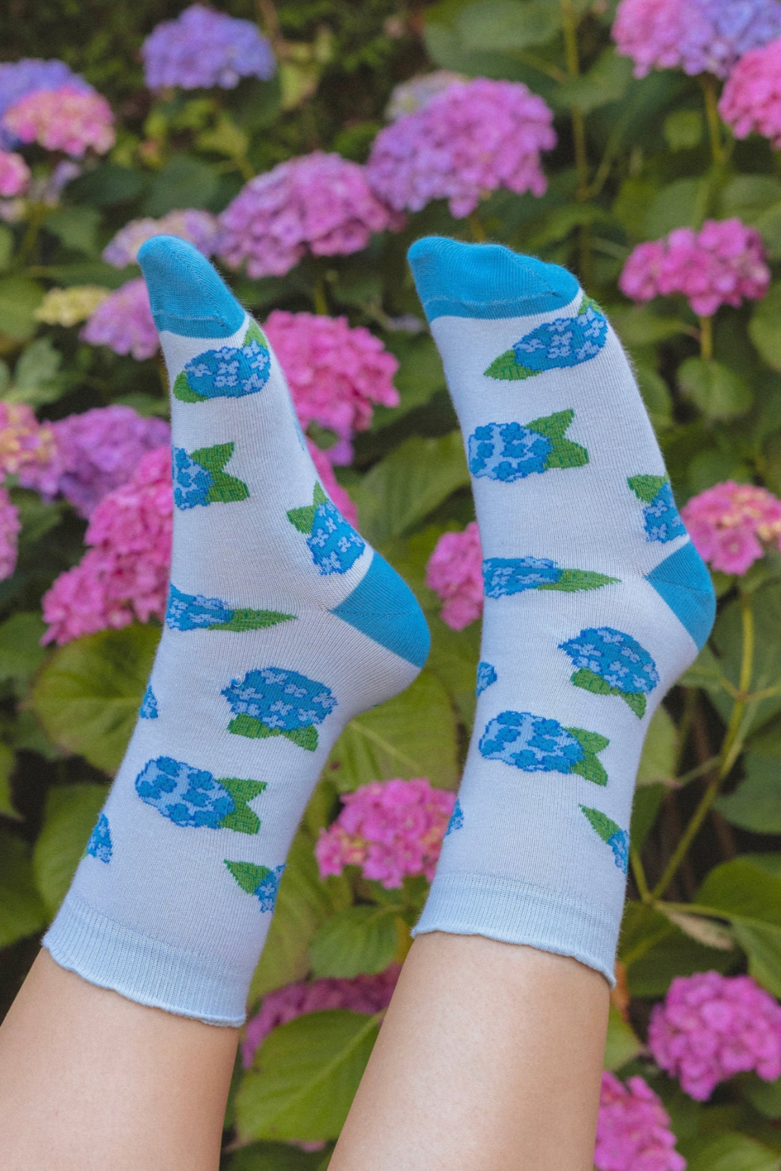 Qui a dit que les hortensias étaient des fleurs de mamie ? On remet au goût du jour ces petites chéries avec nos chaussettes à motif. On craque pour leur côté rétro romantique, leur camaïeu de bleus, et leurs petites fronces tout autour de nos chevilles.