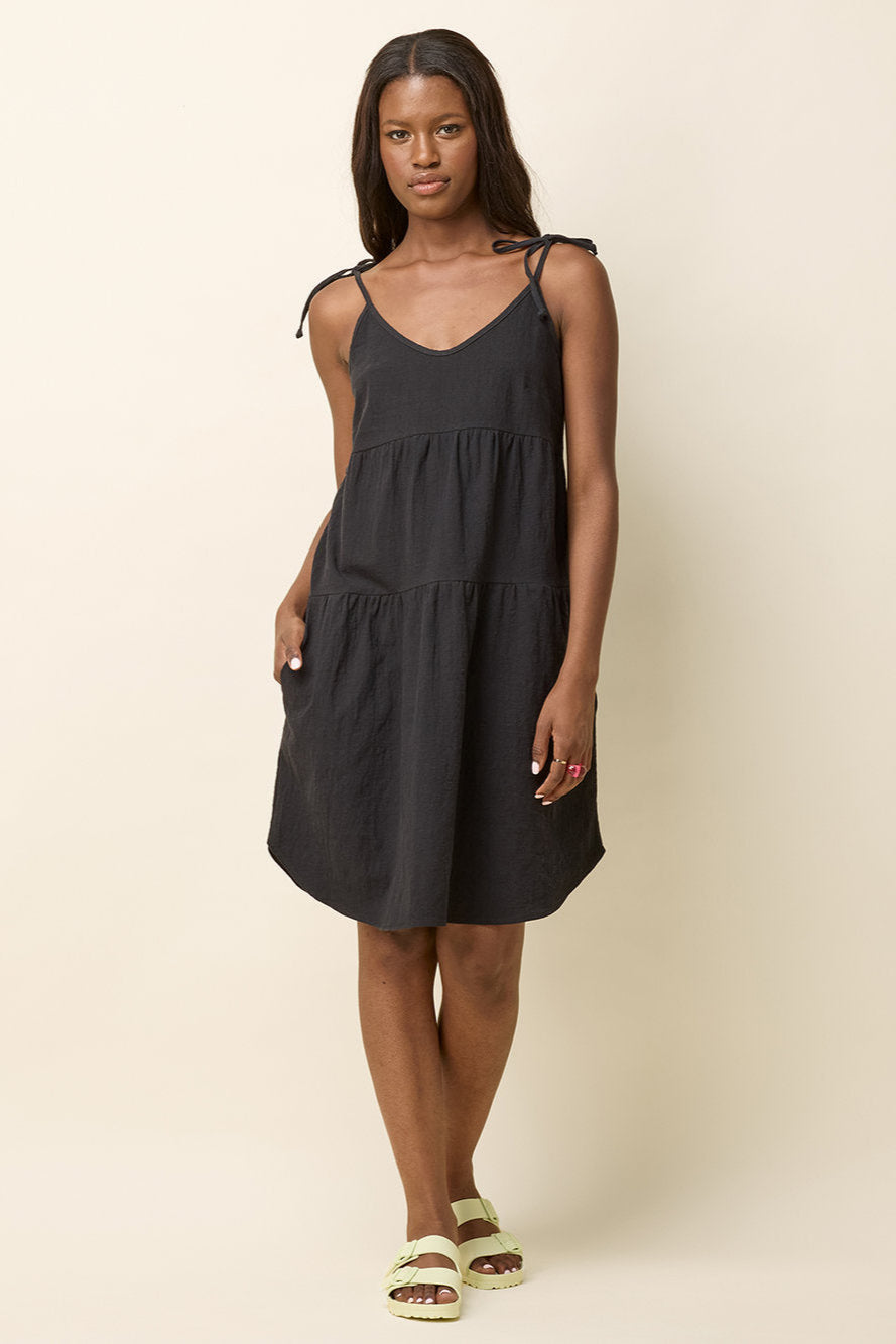 Robe à bretelles spaghetti nouées pour un meilleur maintien au niveau des épaules. On aime les fronces qui ajoutent de jolis détails. Petit plus : elle possède des poches !