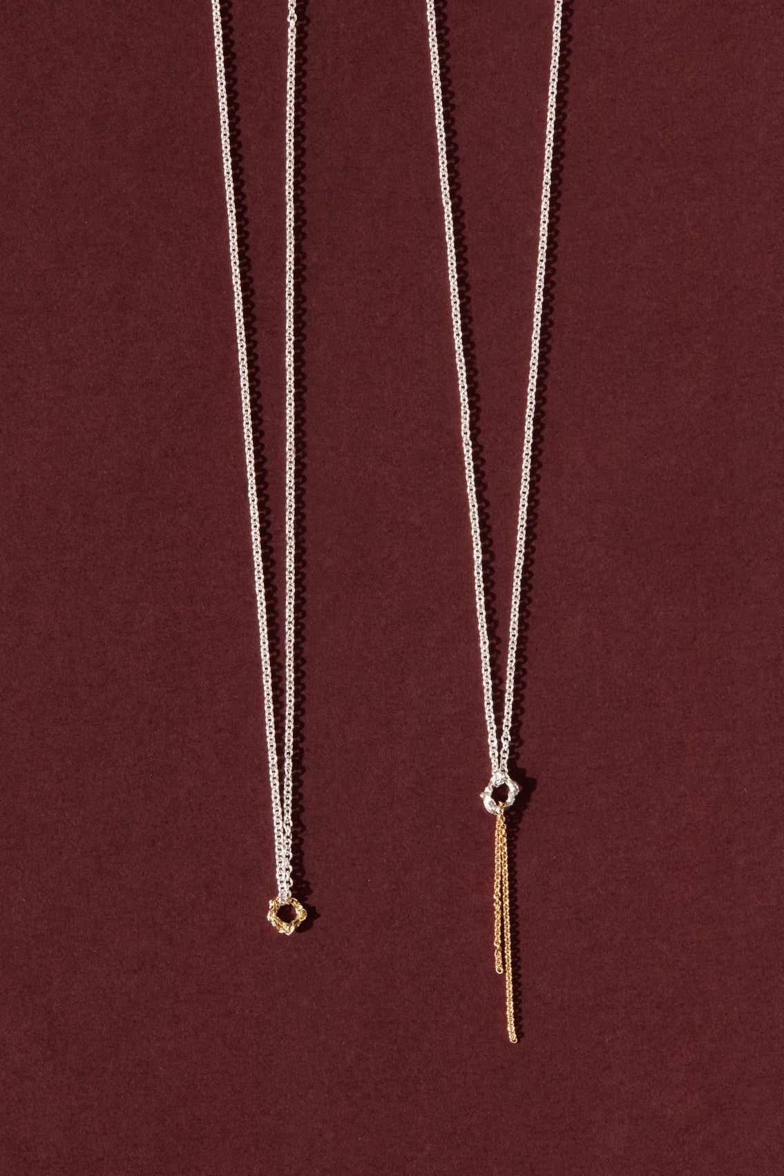 Délicate et aérienne, ce collier combine une fine chaîne avec une texture granuleuse inspirée des transformations métalliques. Légère et raffinée, elle se déplace gracieusement avec vous. Disponible en plusieurs finitions, elle est idéale pour un look à la fois moderne et intemporel.