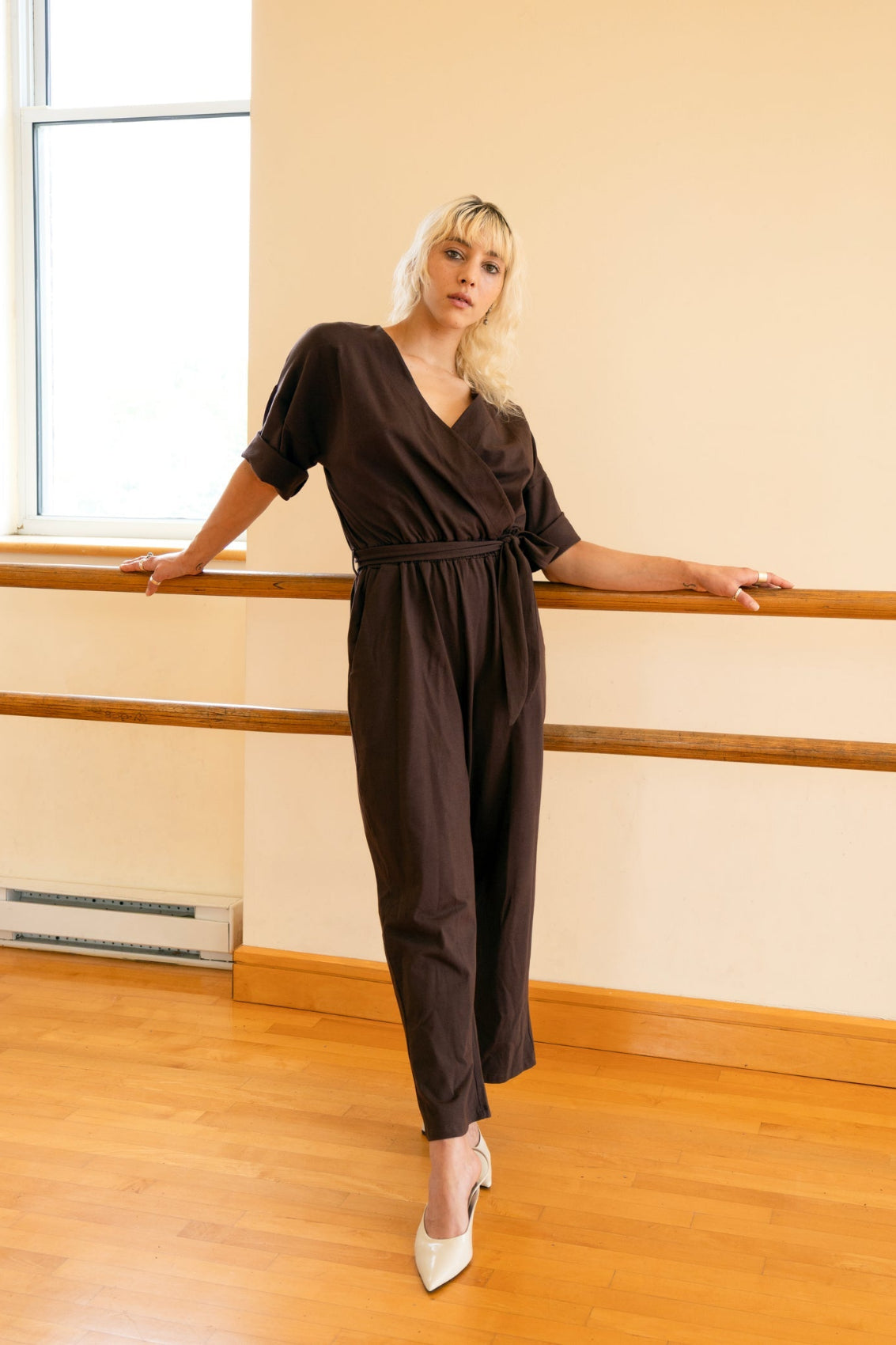 Un basique révisé pour la saison froide avec l'ajout de manches. Cette combinaison croisée à l'avant s'enfile facilement grâce à une bande de taille élastique. Elle est dotée d'une ceinture amovible, de jambes amples, d'une longueur cheville et de poches latérales en biais.