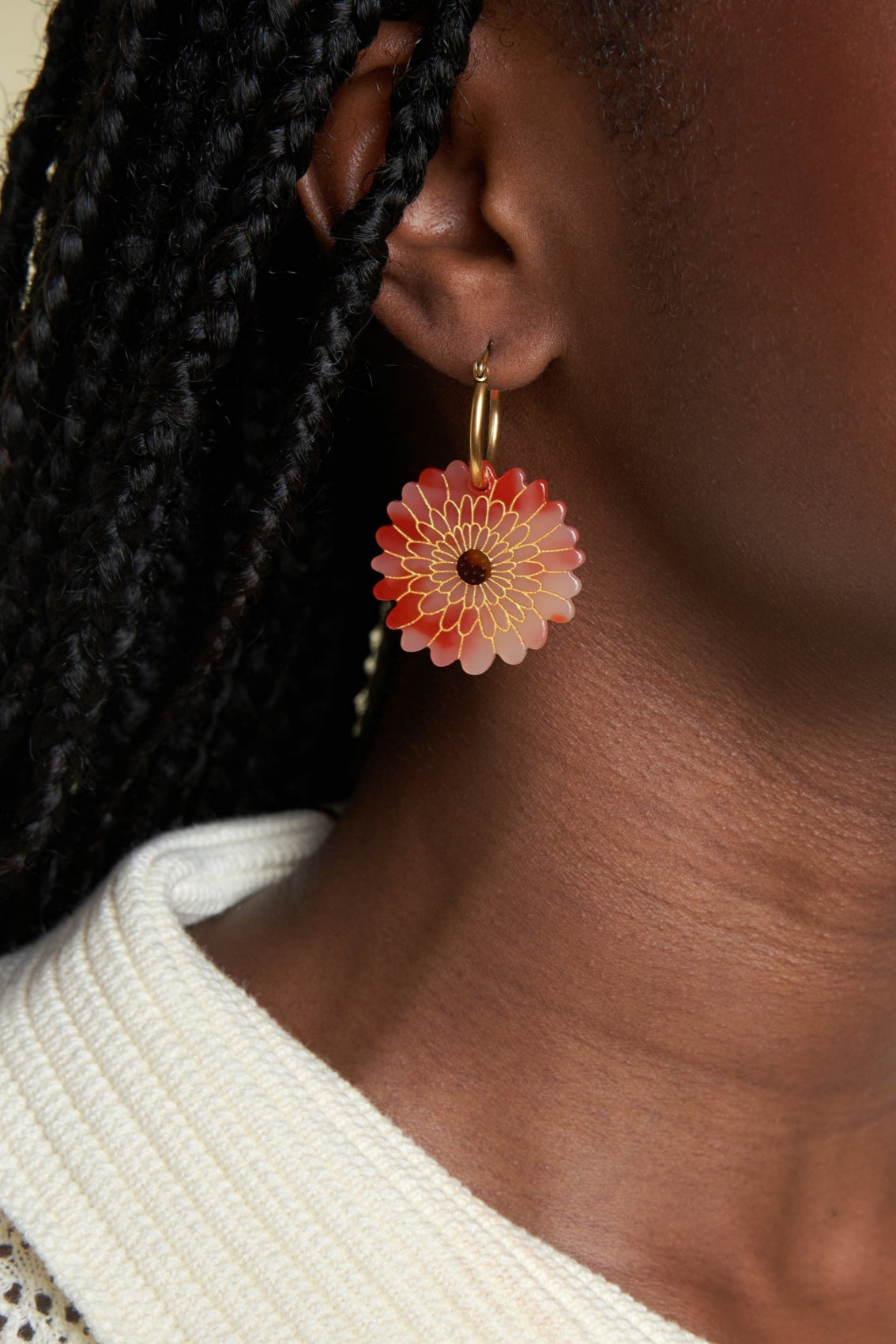 Pour faire fleurir nos oreilles toute l’année, on opte pour cette paire de majestueux dahlias ! Deux grandes fleurs aux innombrables pétales suspendus à des anneaux plaqués or. Un vrai bijou fleuri qui match à merveille avec une coiffure haute.