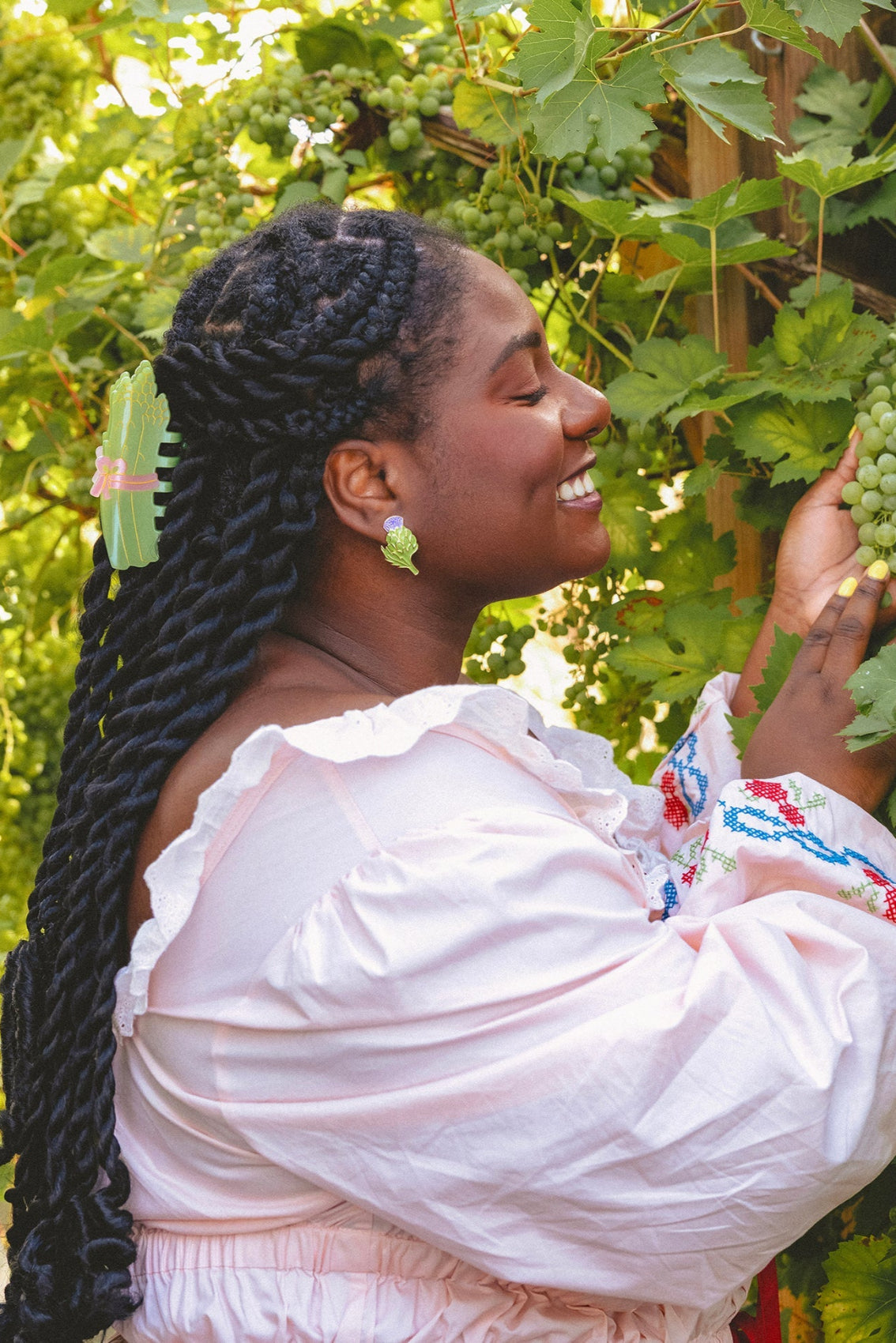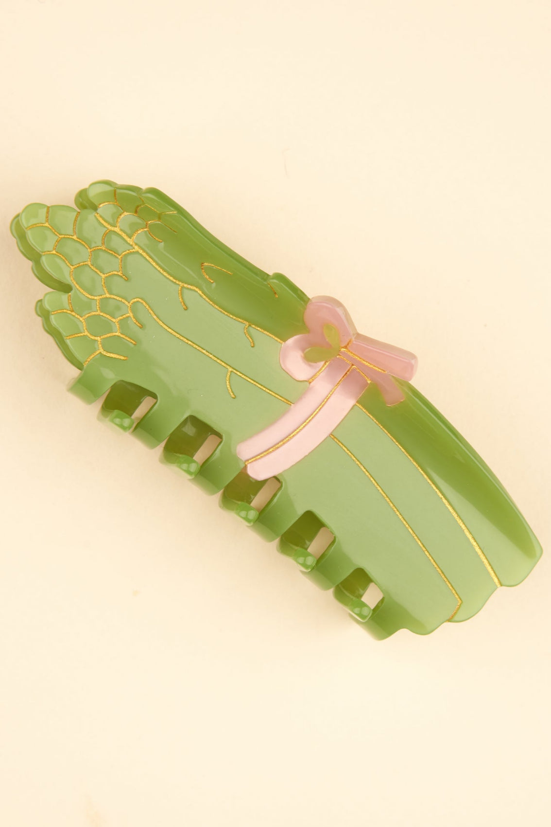 Pour aller faire son marché du dimanche ou s’occuper de son potager, on opte pour la pince à cheveux asperge ! Trois petites choupettes liées d’un beau ruban rose, qui ne demandent qu’à dégager nos minois avec fraîcheur et légèreté. Cet accessoire original maintient parfaitement les chignons bananes et demi-queues pour les cheveux fins comme épais.