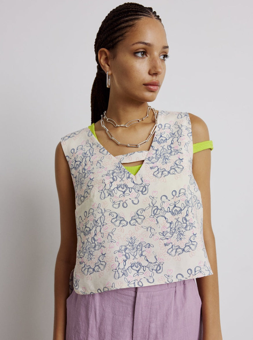 La camisole RILEY de EVE GRAVEL offre une coupe ample et évasée pour un confort optimal. Avec son col V et sa bande caractéristique, elle est à la fois élégante et moderne. Son motif unique, créé en collaboration avec Julia GR, est réalisé dans leurs atelier du Mile End. Ses fentes latérales lui confèrent un tombé fluide pour un look impeccable.