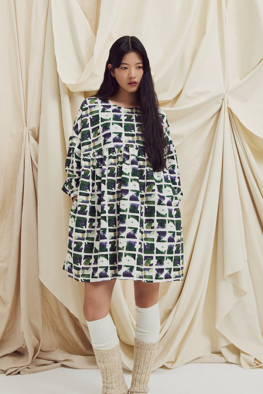 Robe courte à encolure ronde et manches 3/4, joliment froncée à la taille et aux poignets pour un volume flatteur. Elle est également dotée de poches pour plus de praticité. Nos imprimés, créés en interne, rendent cette pièce unique et apportent une touche d'originalité à votre look.