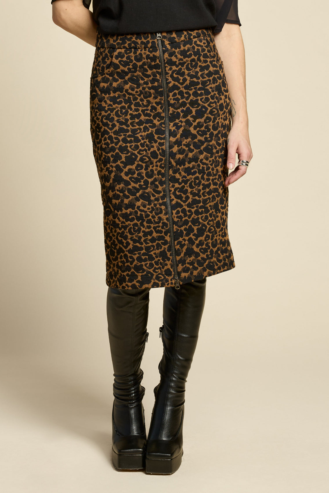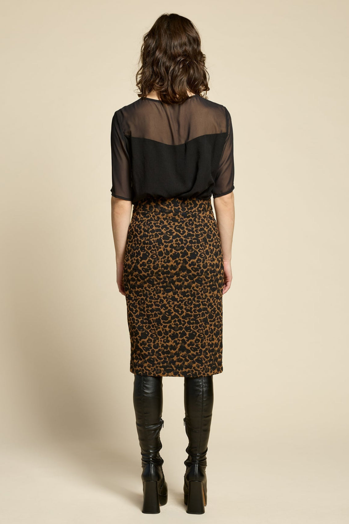 Jupe taille haute, ajustée, réalisée dans notre beau tissu à motif léopard. On aime son détail de zip au devant qui s'ouvre en haut et en bas, permettant ainsi de créer une ouverture pour plus de liberté de mouvement si nécessaire, et pour ajouter un autre petit détail original!
