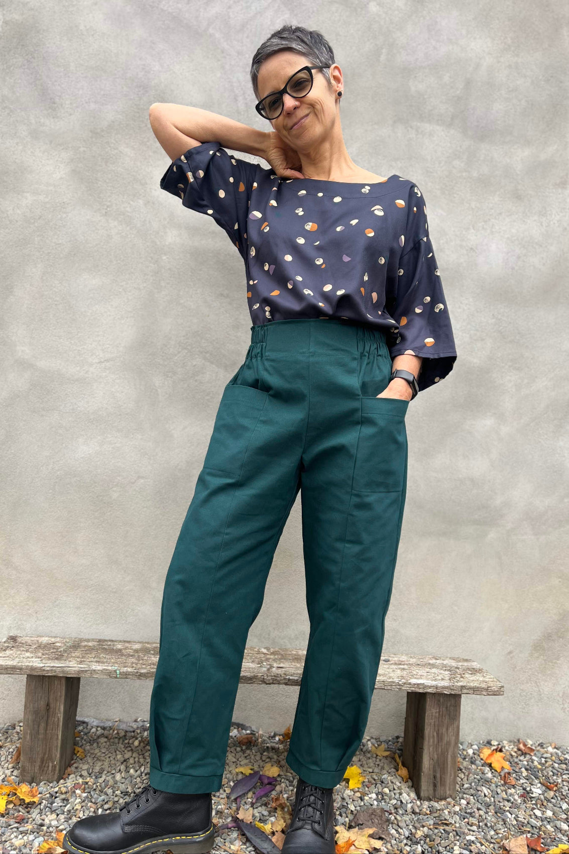 Ce pantalon jambe tonneau / baril se termine par une bande plus serrée dans le bas et  possède deux grandes poches sur le devant .