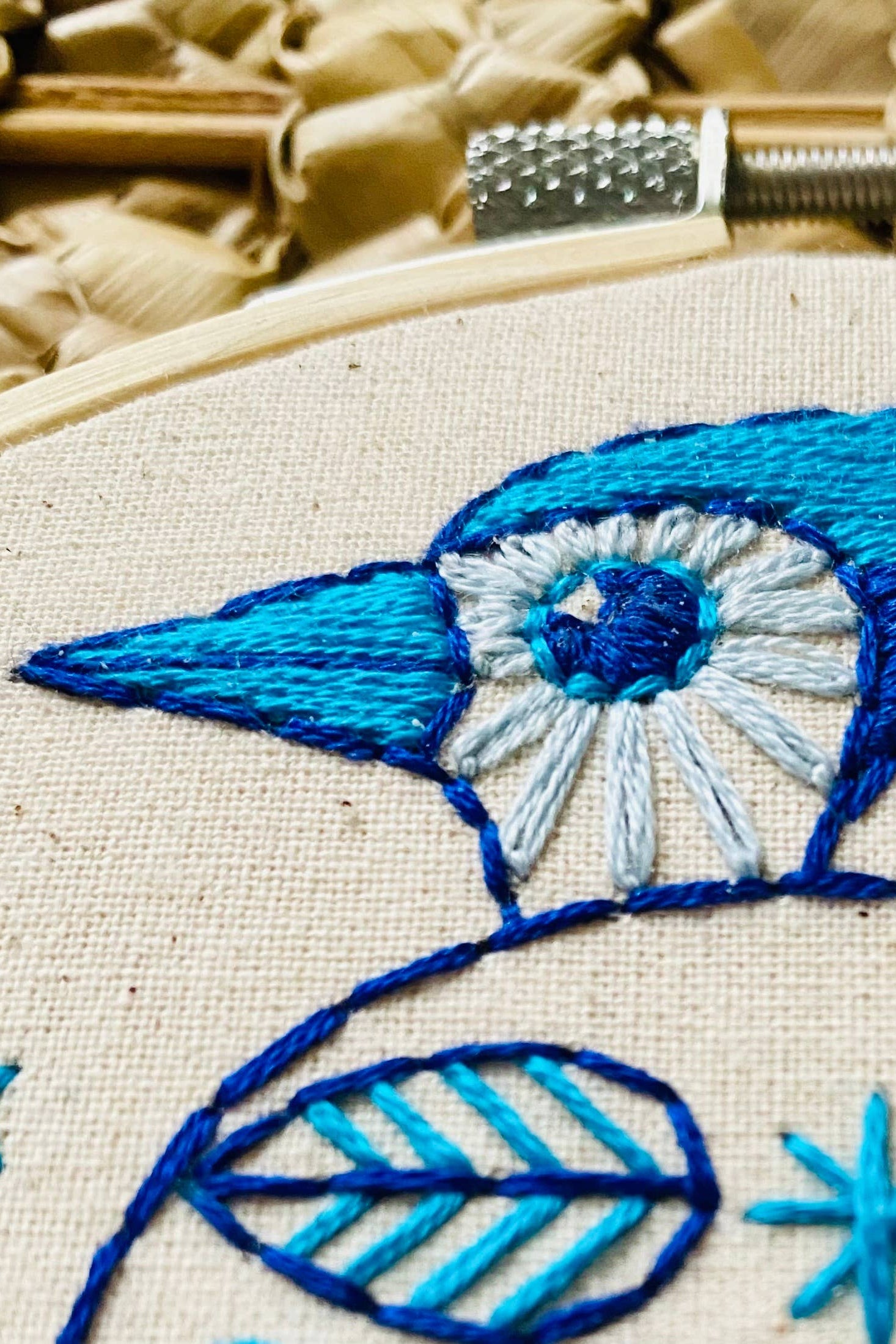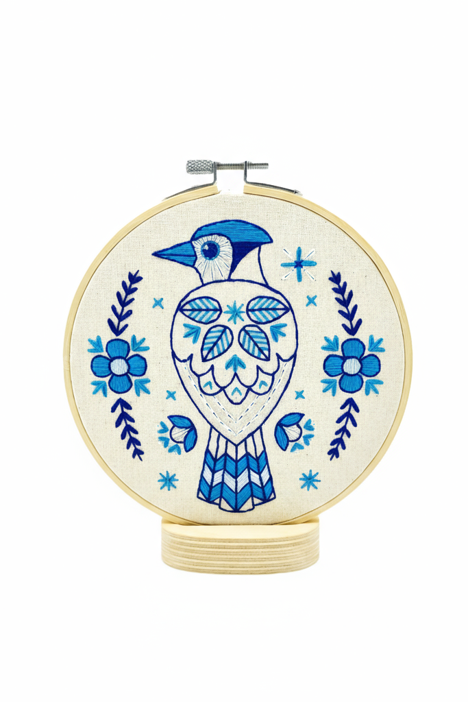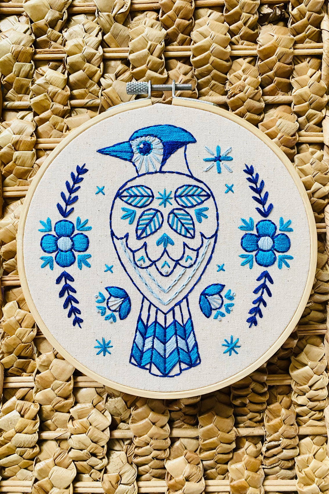 Notre geai bleu possède une palette tonale unique de 3 couleurs vives et propose une combinaison unique de satin, de maillon, de chaîne, de nœud français et de point au dos. Conçu dans notre style folklorique moderne emblématique d'inspiration scandinave et nordique.
