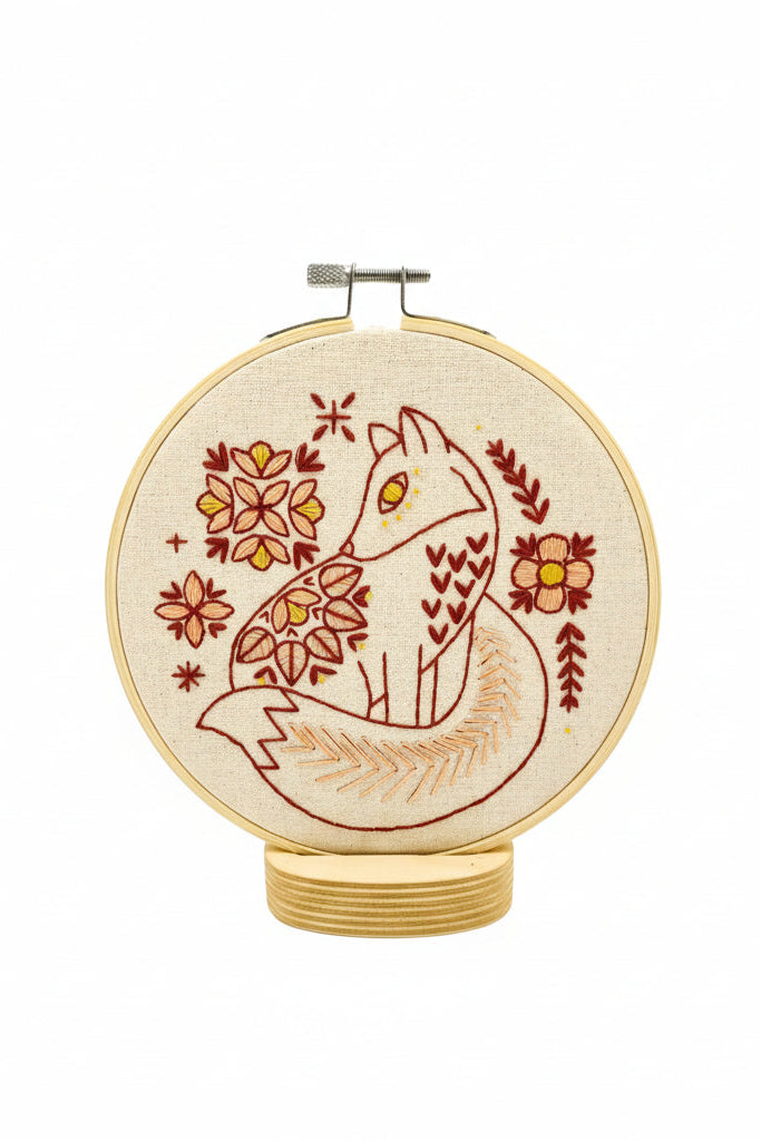 Notre motif Folk Fox en couleur possède une palette de tons unique de 3 couleurs vives et présente une combinaison unique de satin, de maille, de point arrière et de nœuds français. Conçu dans notre style folklorique moderne typique d'inspiration scandinave.