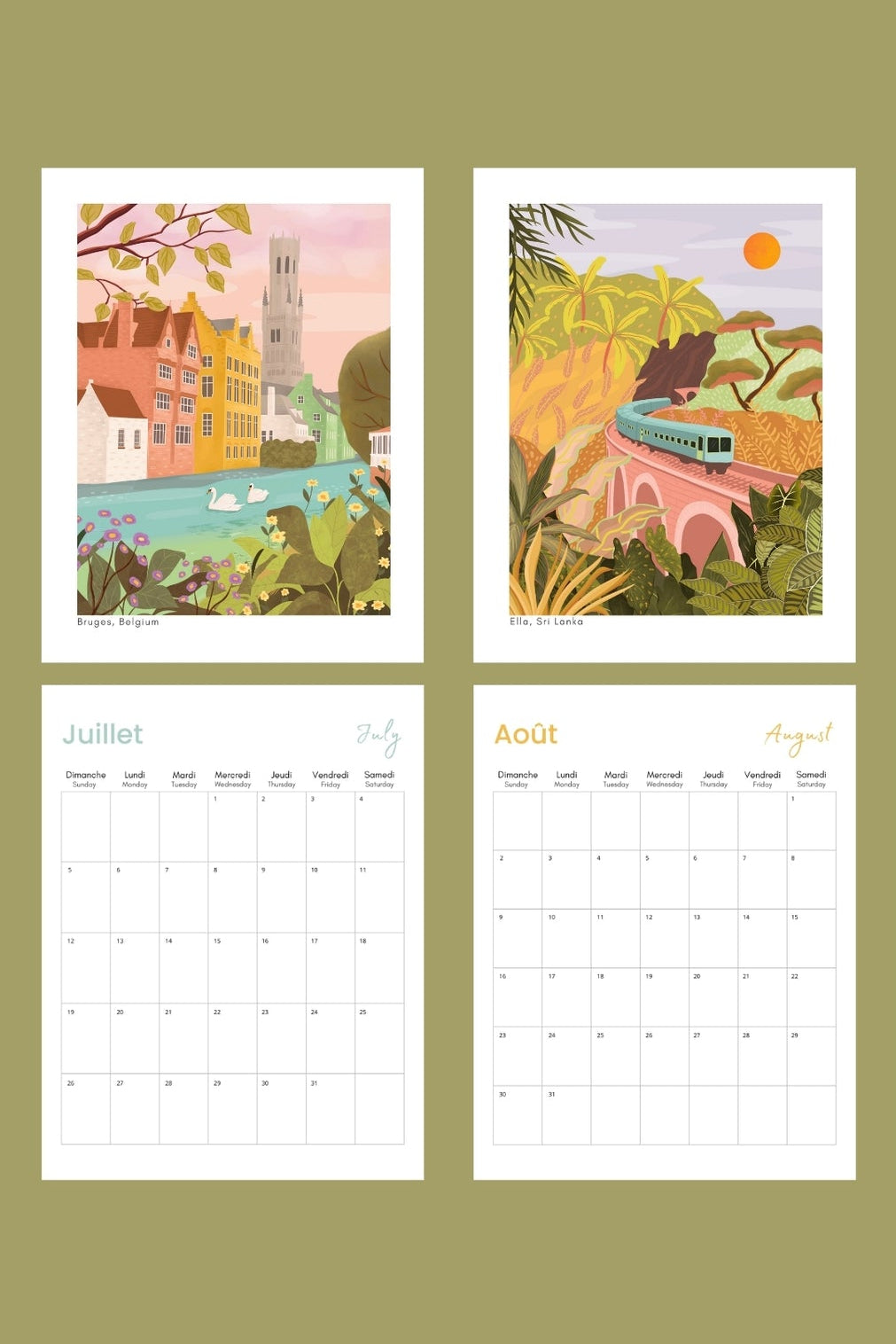 Une fois le mois terminé, découpez simplement l'illustration et encadrez-la pour créer une collection de douze œuvres d'art uniques sur le thème du voyage.