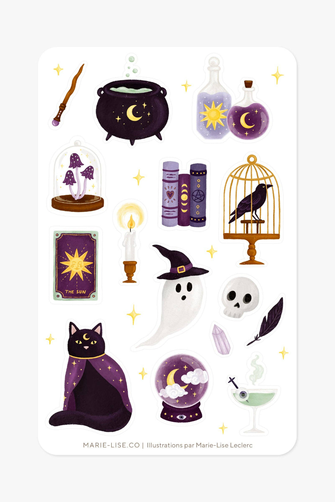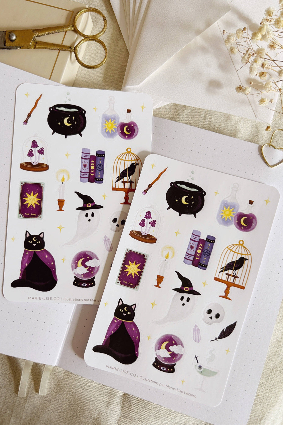 Feuille d'autocollants sur le thème Halloween et sorcellerie. Parfaits pour décorer des journaux à puces, des agendas, des calendriers, des cartes de souhaits, des objets de bureau, des notes, des albums, etc.