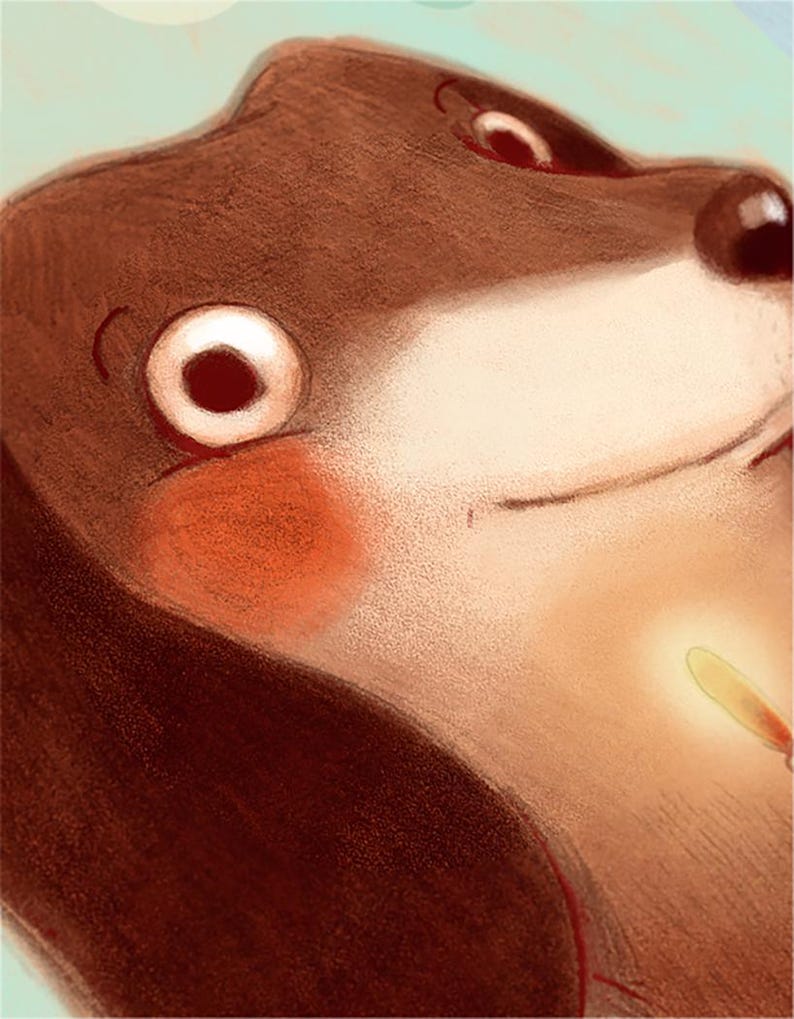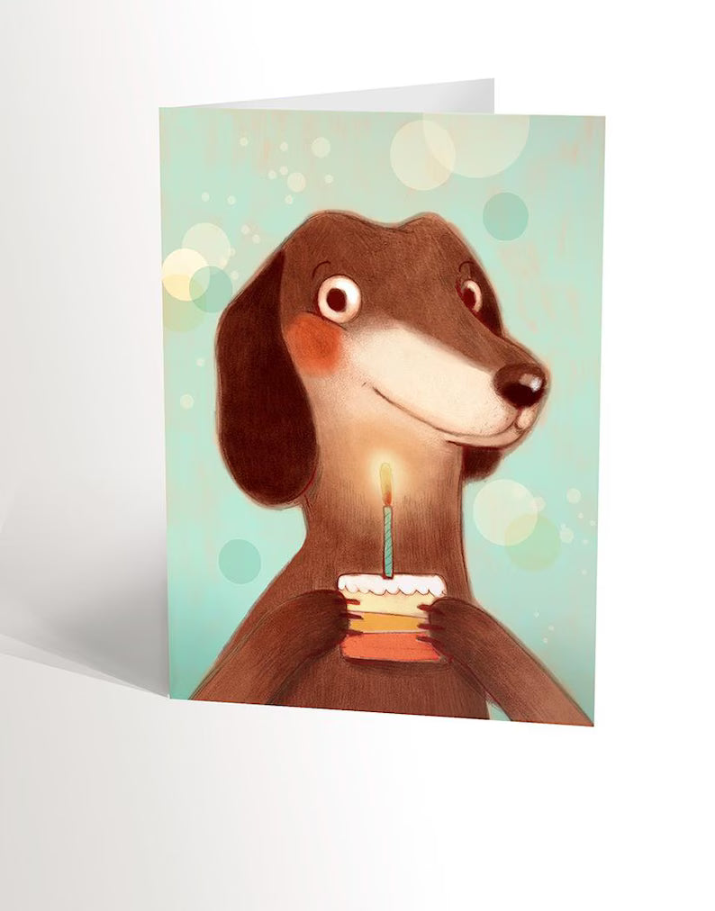 Carte de souhait, avec un chien saucisse tenant une part de gâteau de fête!