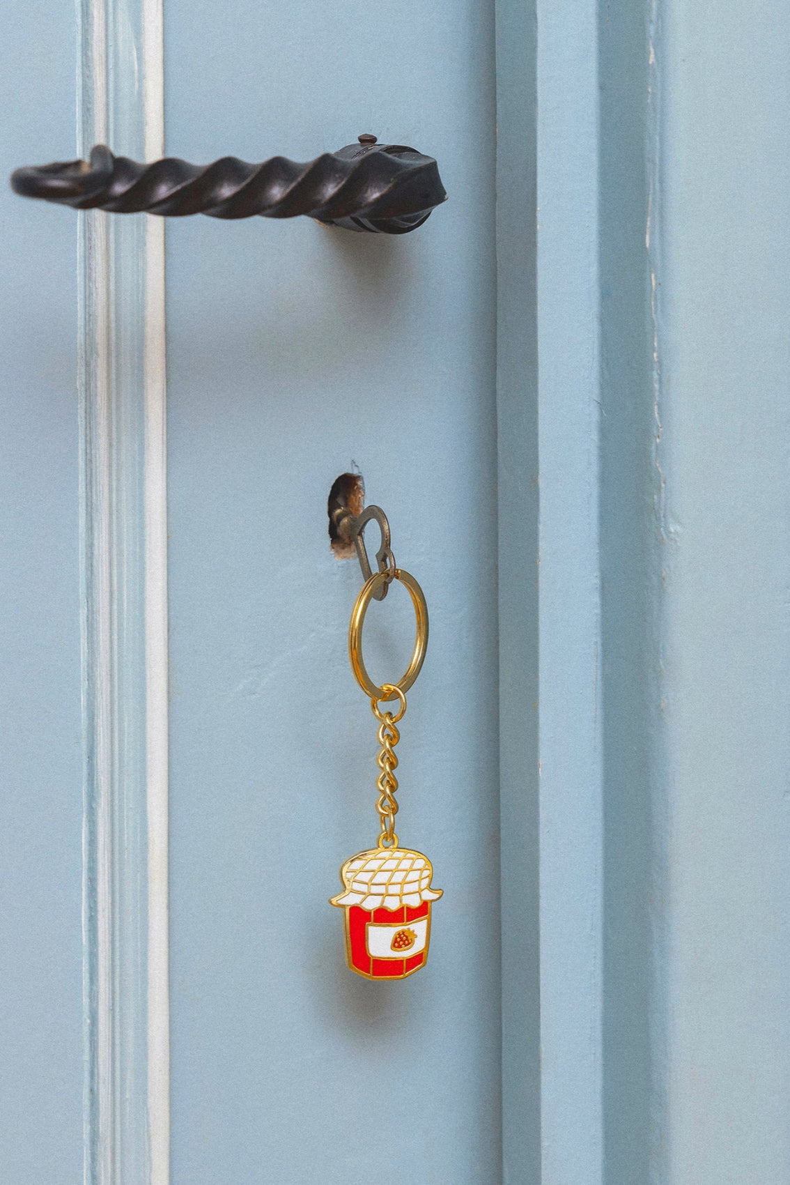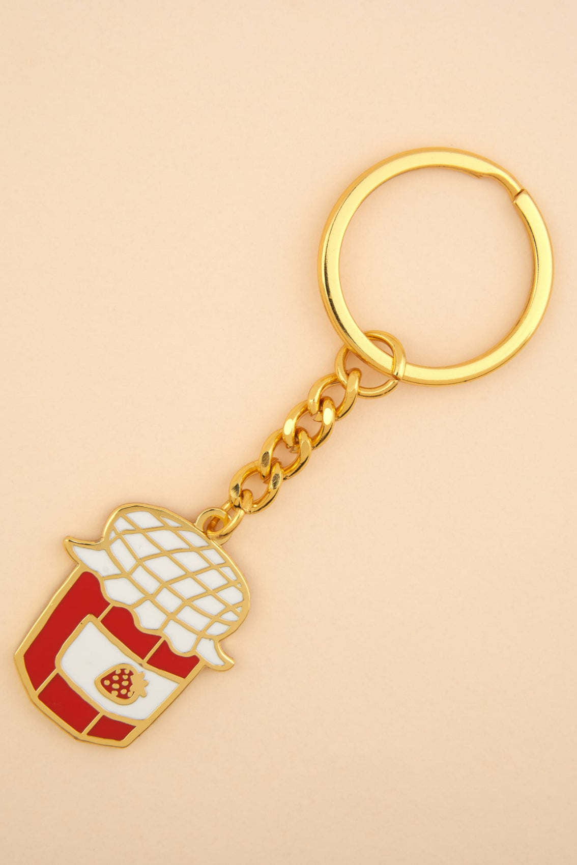 Pour changer du porte-clés moche ramené de voyage par Tonton, on opte pour cet adorable pot de confiture à la fraise souligné de jolies dorures, non sans nous rappeler les petits-déjeuners en famille. Enfin un accessoire à la hauteur de notre trousseau.