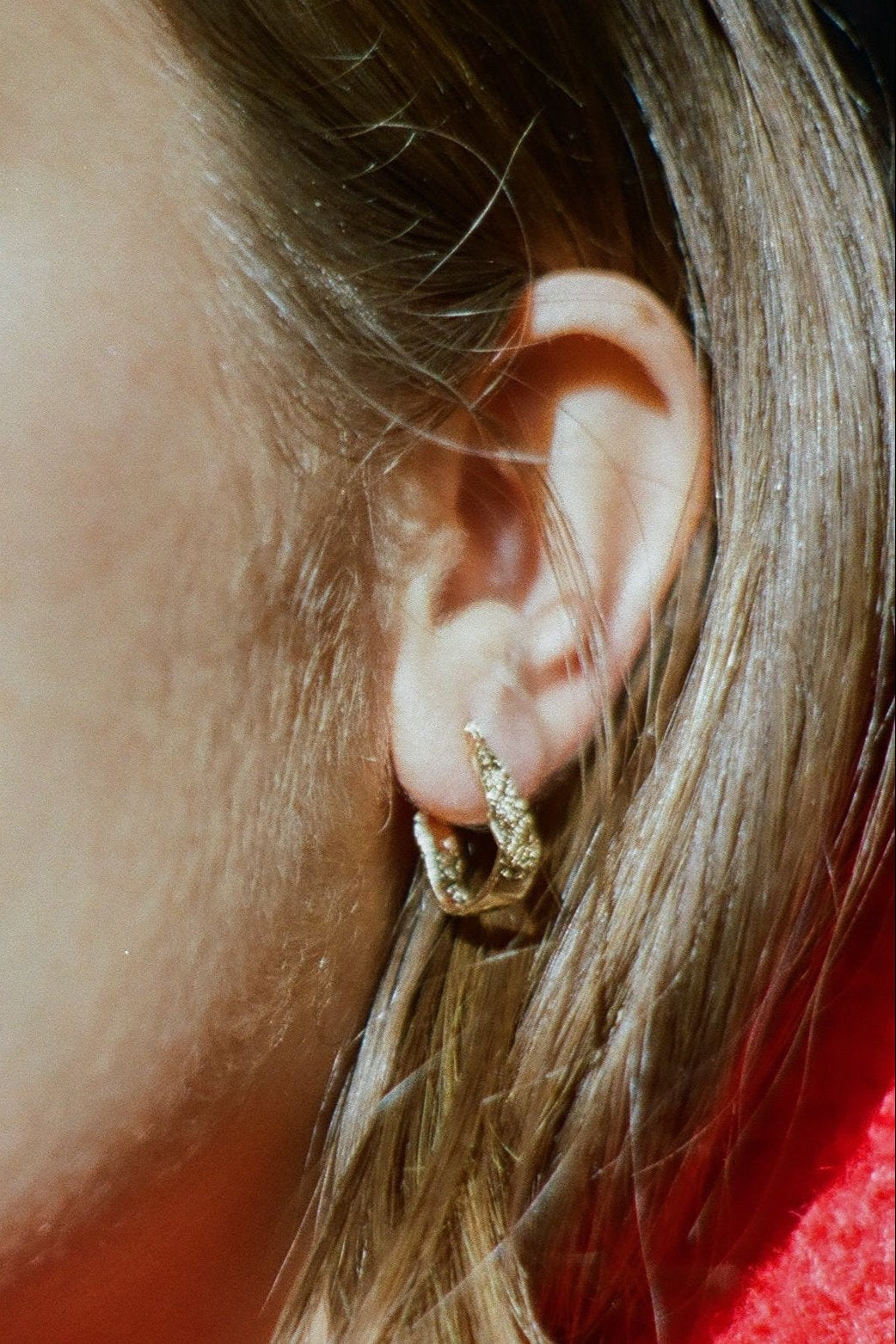 Ces dormeuses font partie de la collection DUNES qui célèbre le sable des Îles, matériau brut évoquant la plage. La texture créée par le trempage des cires directement dans le sable de l'Anse à la Cabane confère aux pièces une empreinte insulaire, devenant ainsi un fossile de vacances.