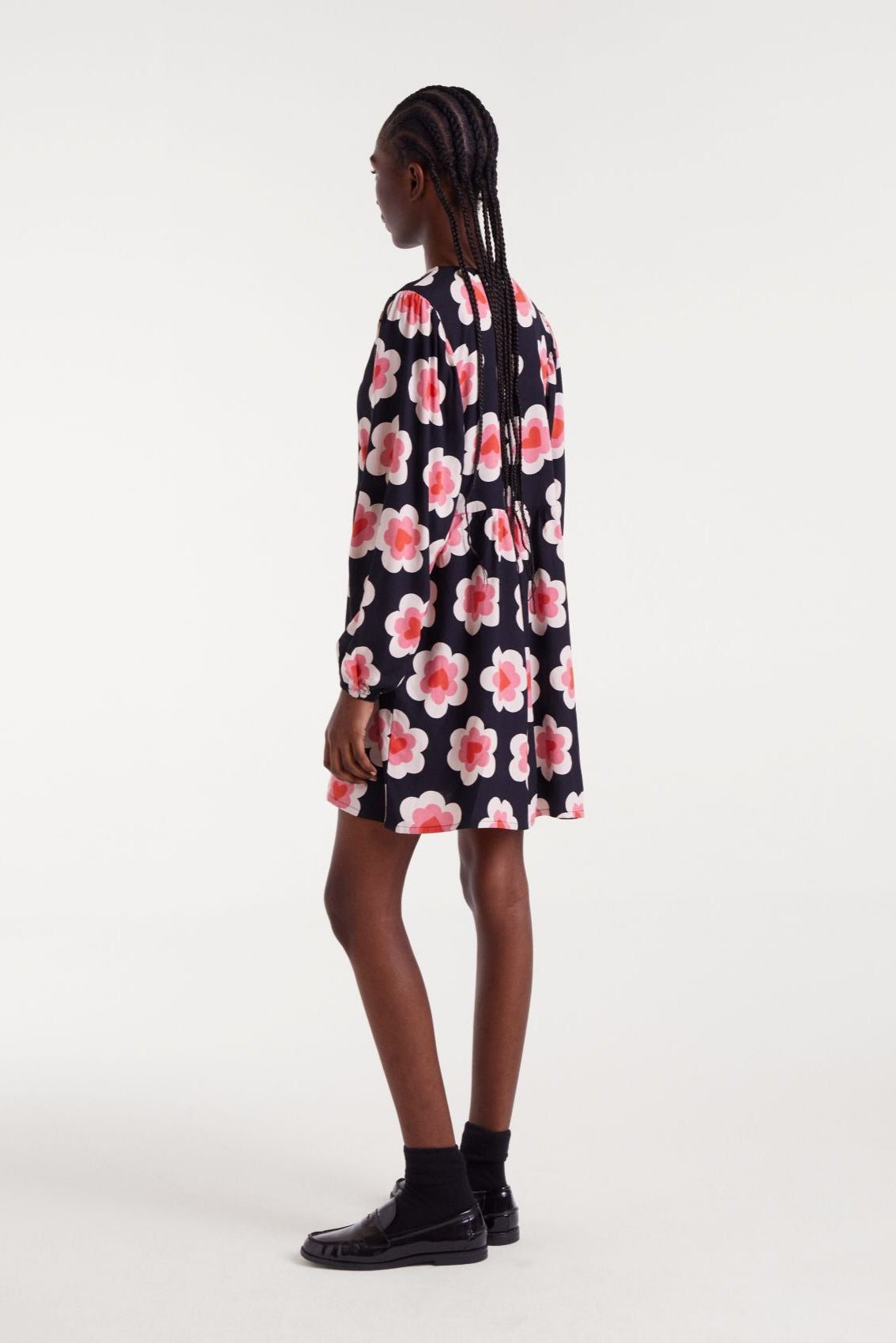 Robe courte à imprimé cœur. Encolure bateau et décolleté en V noué sur le devant. Manches longues avec poignets élastiques. Poches latérales.