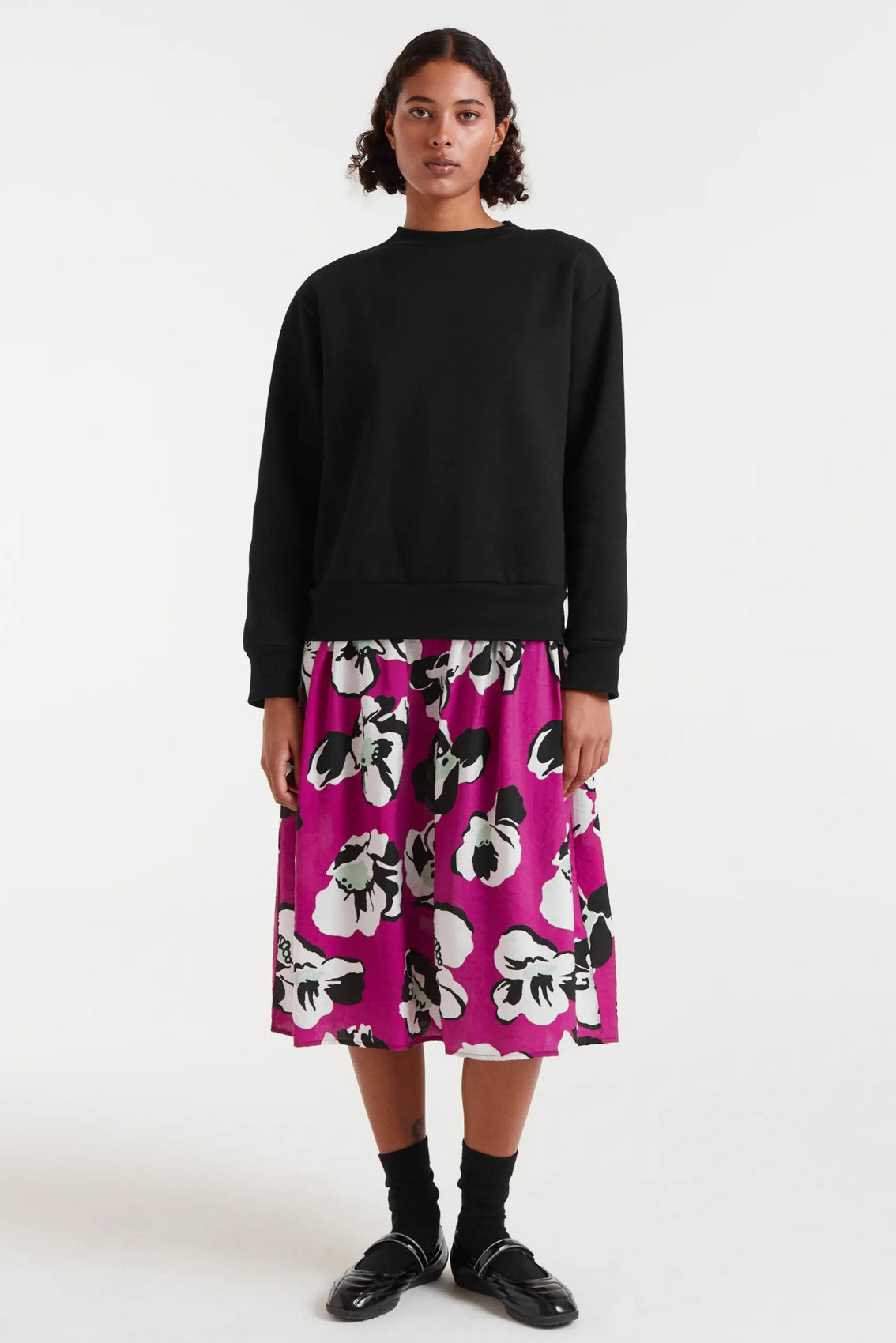 Robe midi à imprimé Viola vif. Combinaison de polaire pour le haut et de crêpe pour la jupe. Col rond et manches longues. Épaules légèrement tombantes