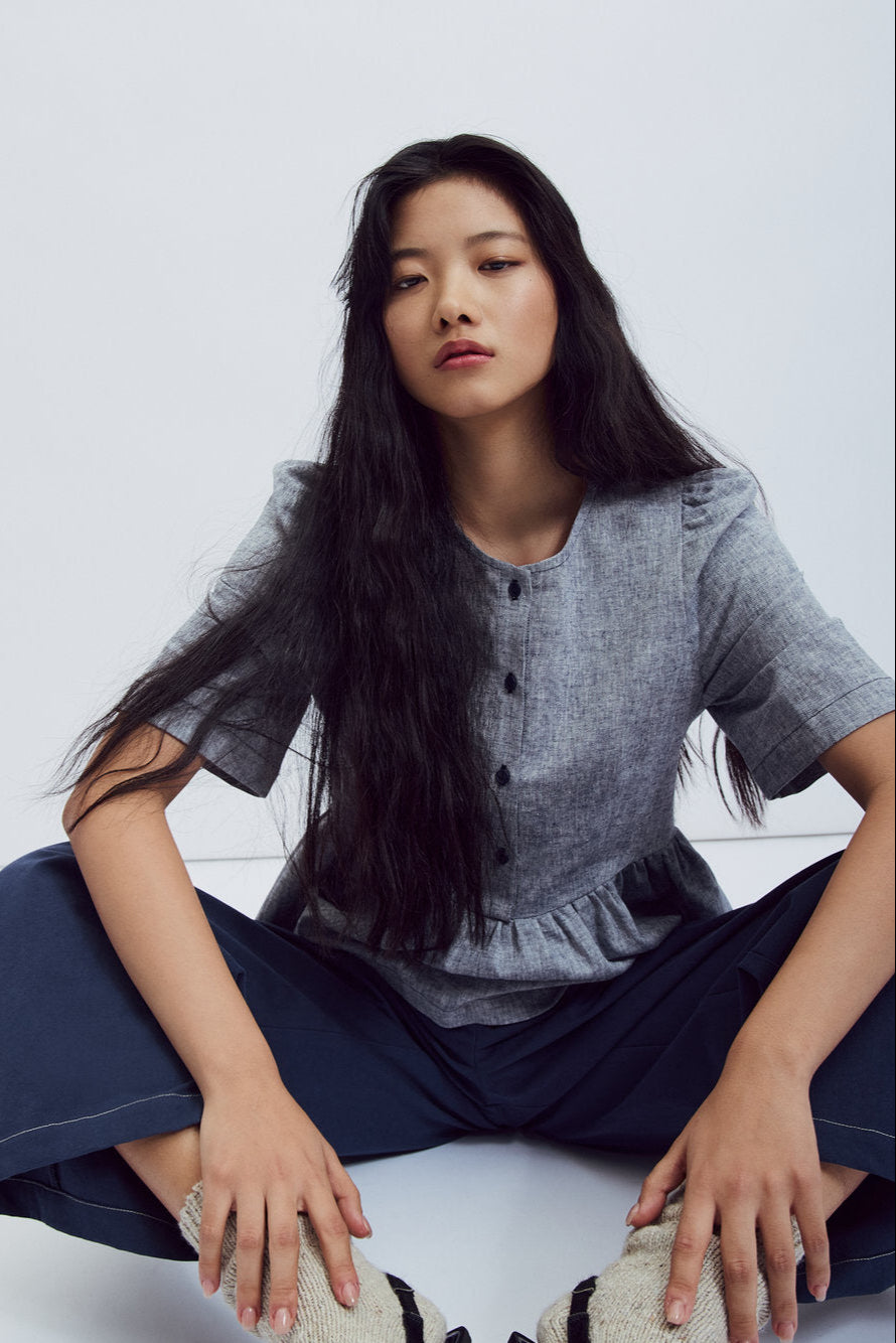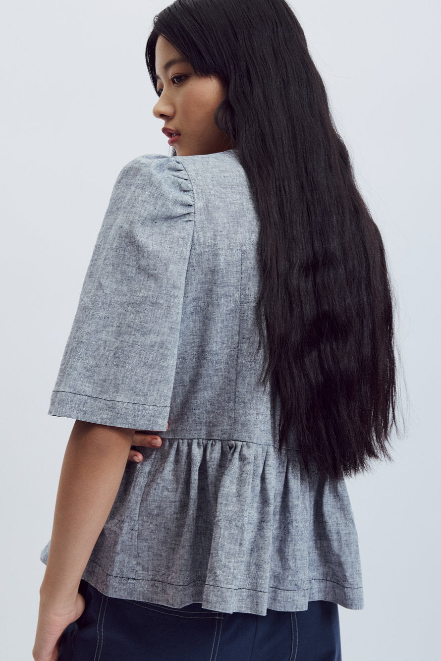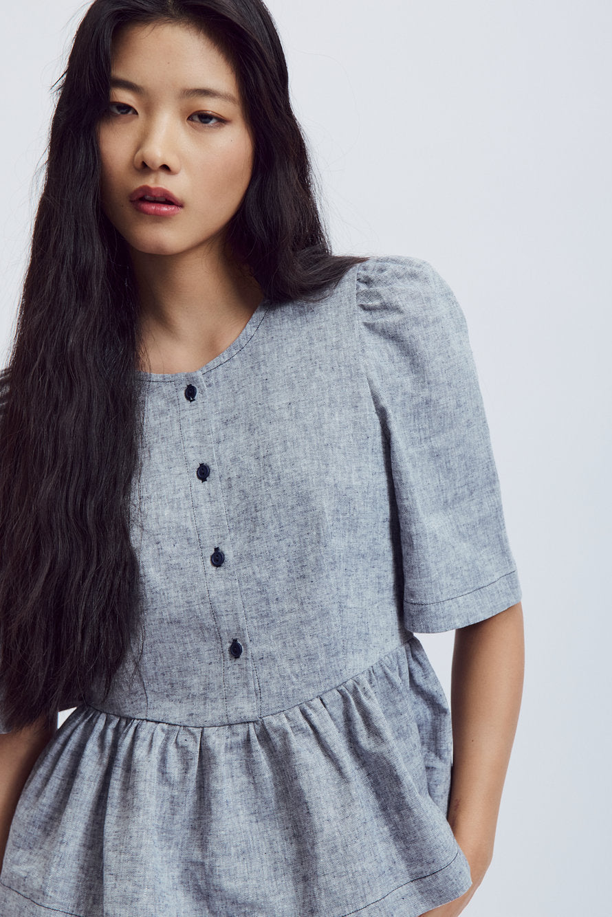 Haut péplum avec patte de boutonnage sur la poitrine. De délicats volants sous la poitrine apportent un joli volume et mettent en valeur la silhouette.