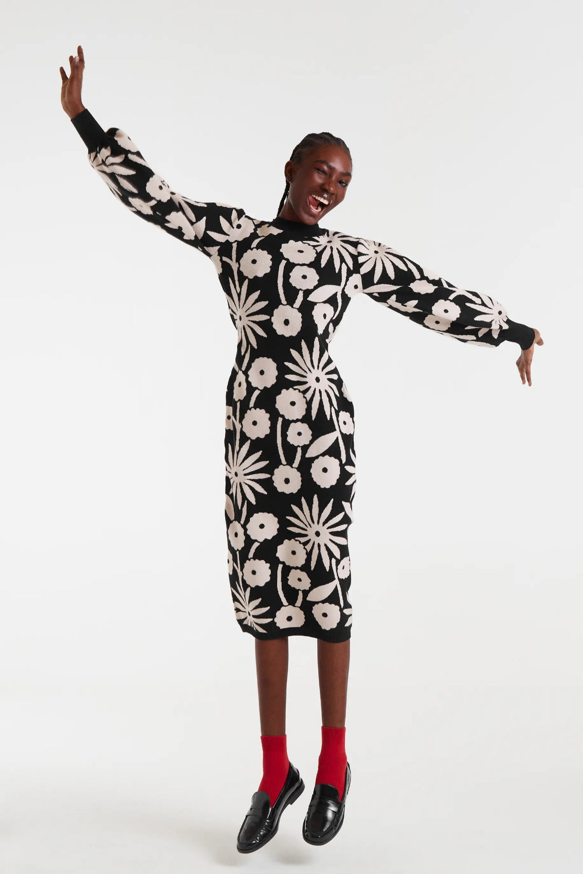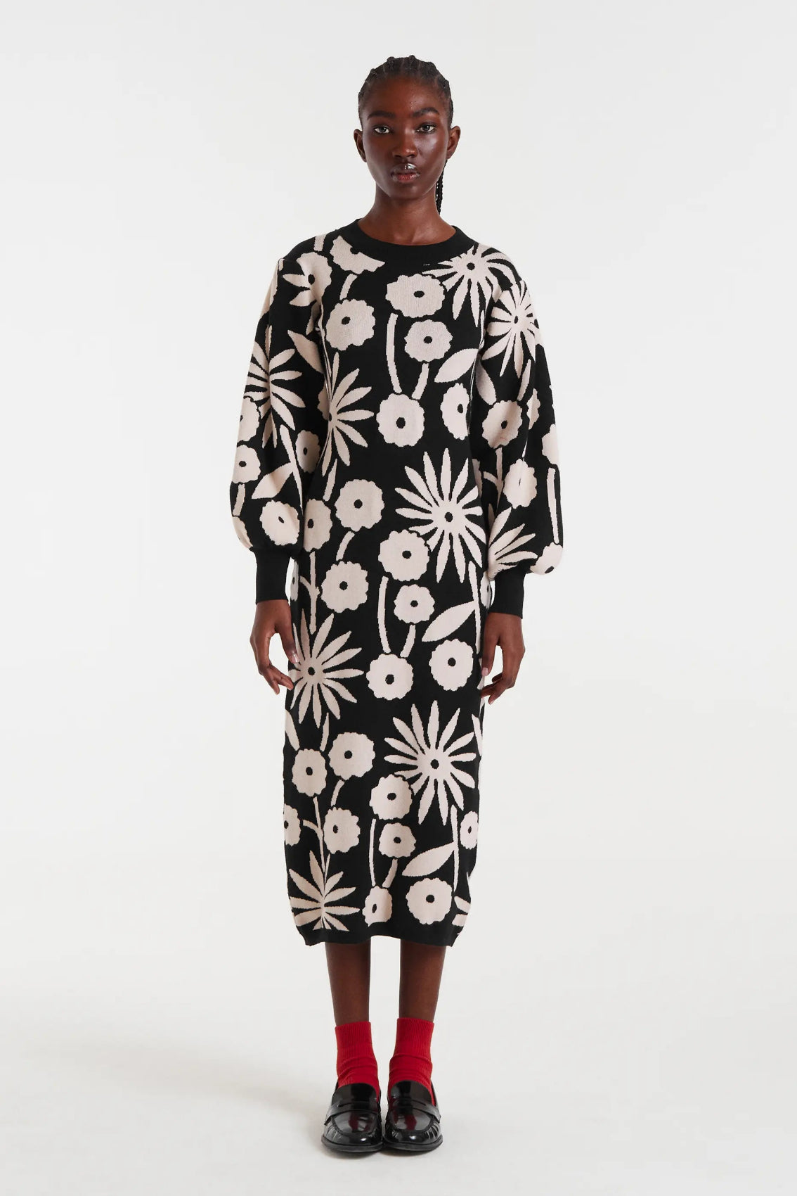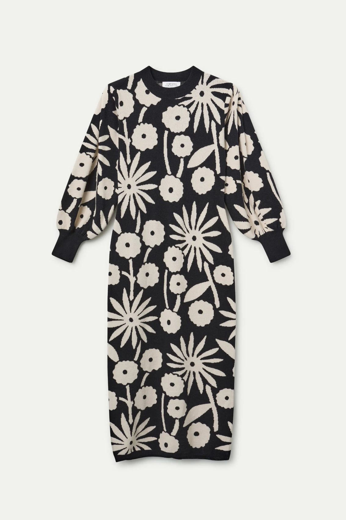 Robe midi en jacquard imprimé tofu. Encolure ronde et manches longues bouffantes. Finitions côtelées.