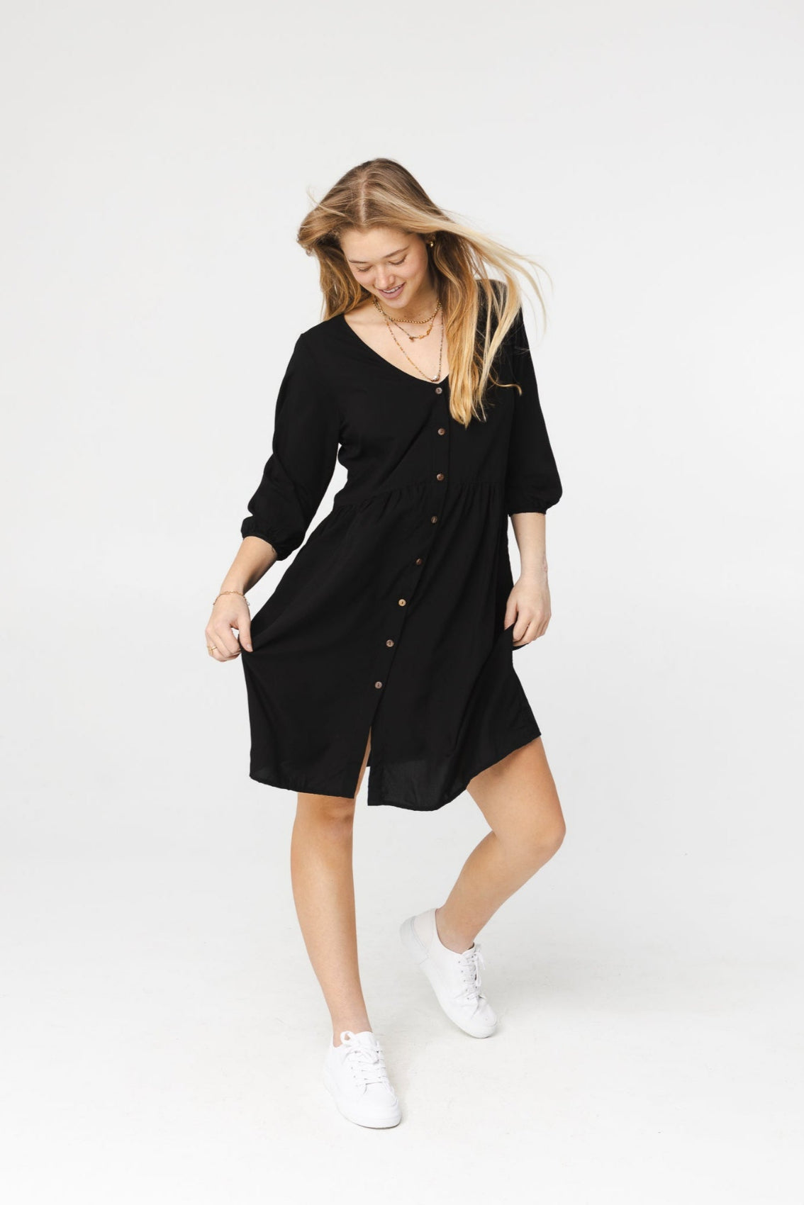 Robe noire très fluide et extrêmement pratique à manches 3/4, de longueur midi.