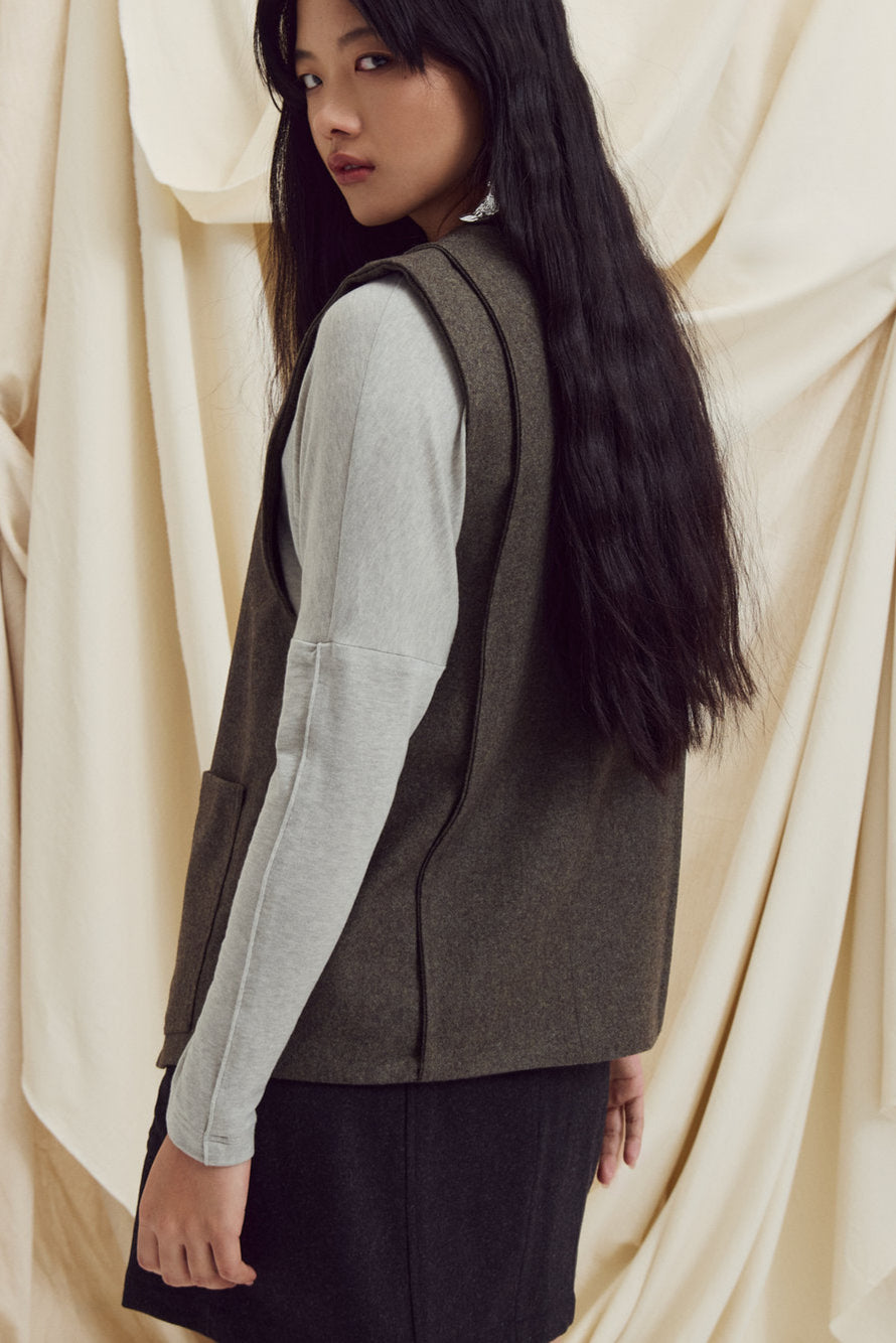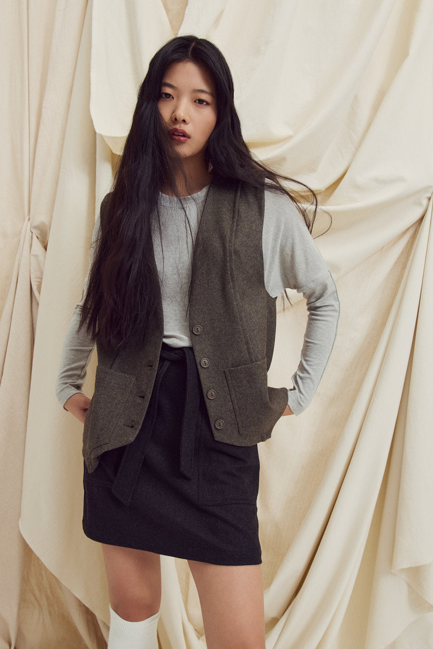 La veste en tweed sans manches, inspirée de celle que vous avez « empruntée » à votre grand-père, revisitée avec brio ! Le style rétro est de retour, plus fort que jamais. Enfilez-la par-dessus l'un de nos basiques ou un simple t-shirt blanc, et le tour est joué ! Avec sa pointe subtile et ses plis à l'avant et à l'arrière, elle apporte texture et attrait visuel. Elle est également dotée de deux poches plaquées et d'une doublure pour un confort optimal, alliant style et praticité.