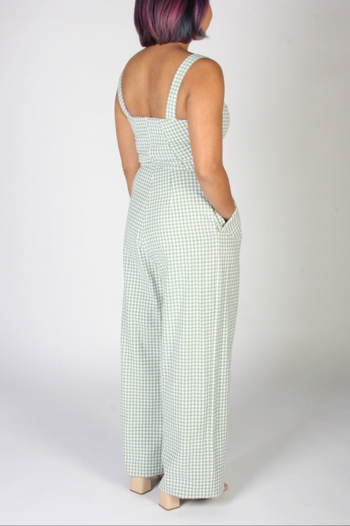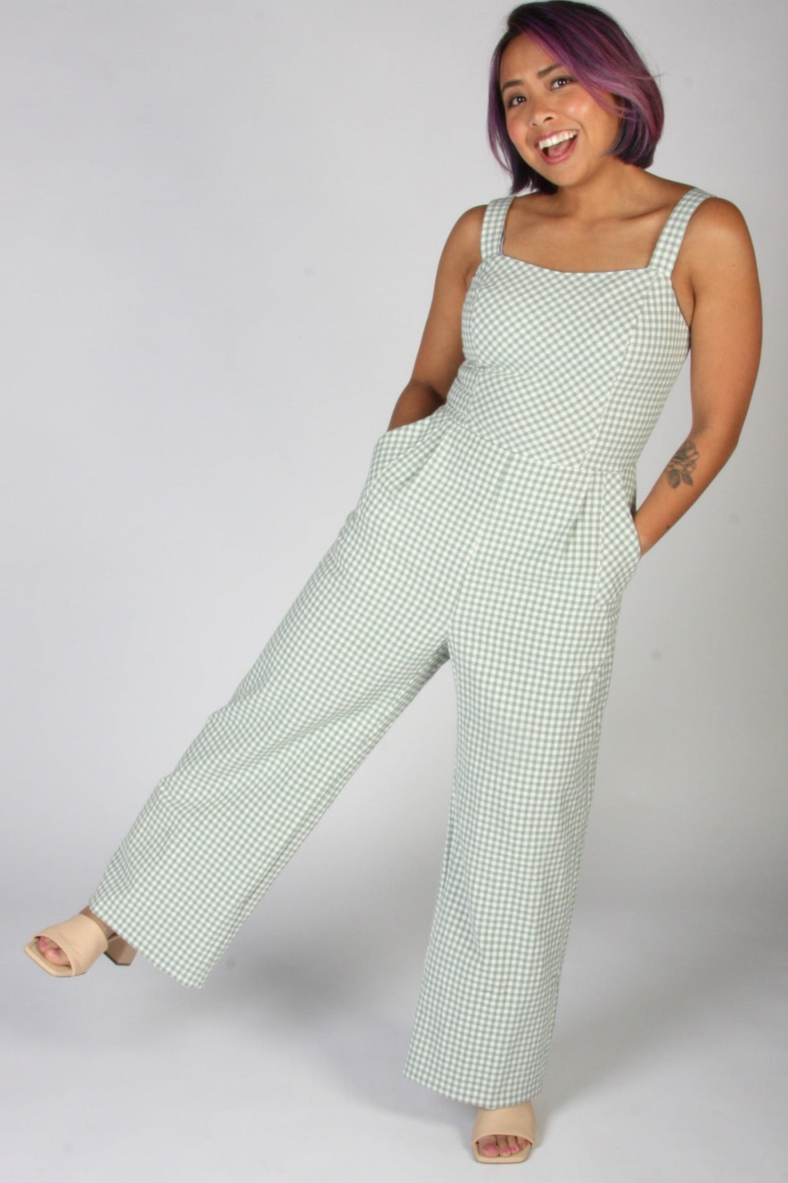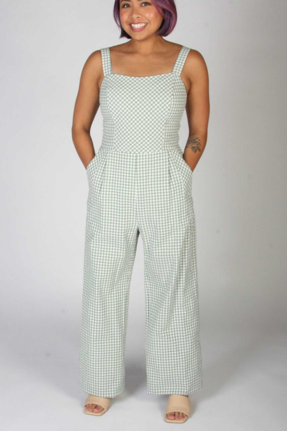 Roadrunner est une combinaison pantalon à jambes larges et cintrée, confectionnée en vichy de coton biologique mi-lourd. Elle présente des détails vichy originaux sur le haut et les poches avant. L'encolure est ornée d'une parementure et elle se ferme par une fermeture éclair invisible au dos.