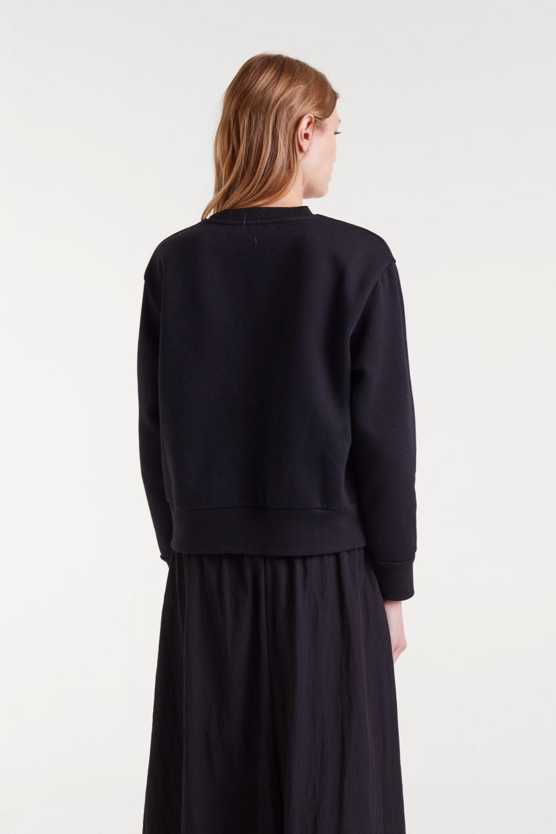 Sweat-shirt polaire noir à col rond et manches longues. Un nœud perlé à l’encolure. Bordure côtelée.