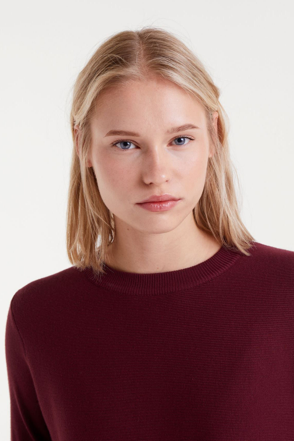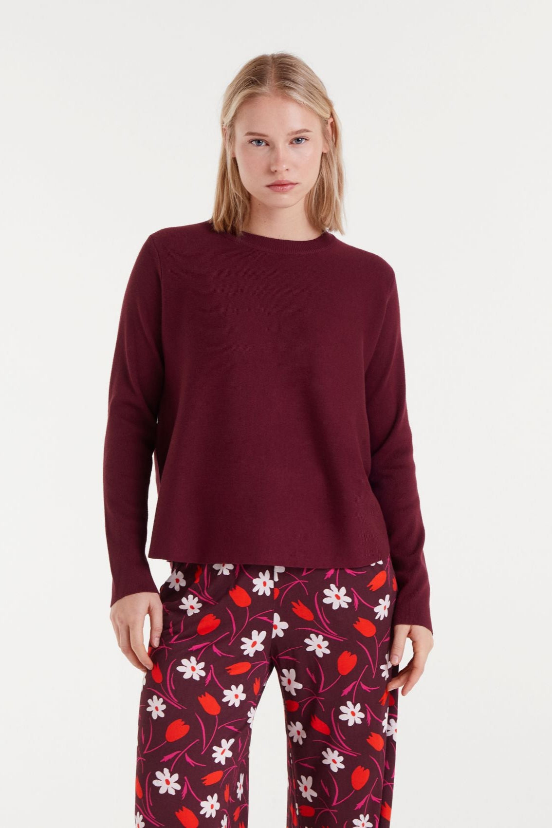 Pull en maille bordeaux à encolure dégagée et manches longues.