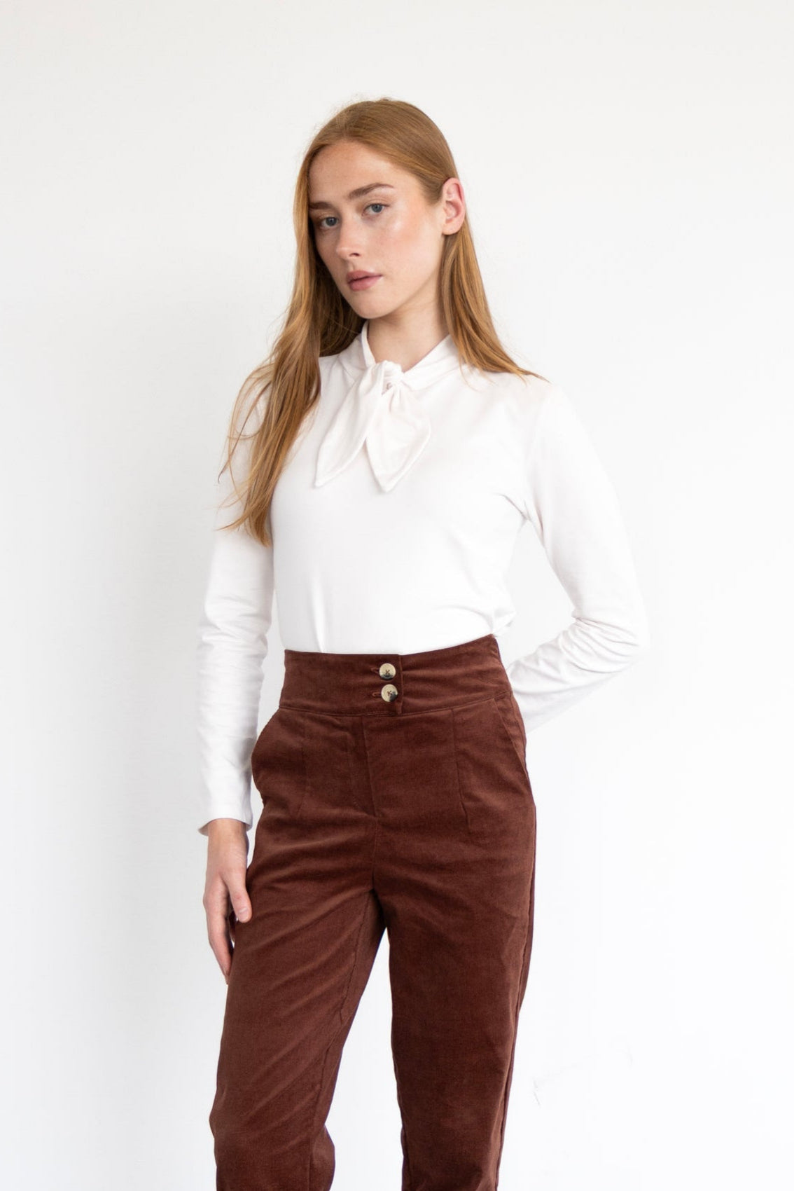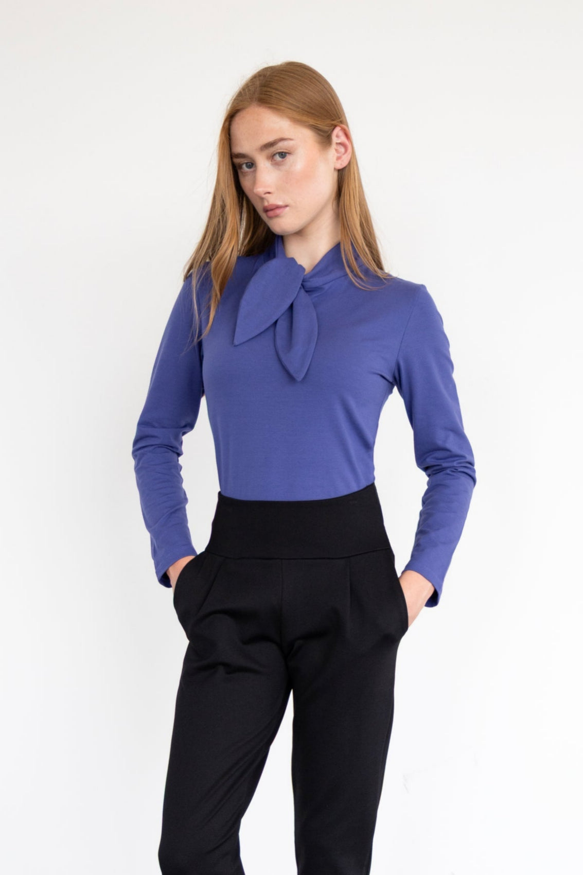 Top ornementé d'une boucle intégrée au col, pour une touche de féminité et d'originalité tout en subtilité. Il a des manches longues et une coupe à la longueur des hanches, idéale pour un look soigné et polyvalent.