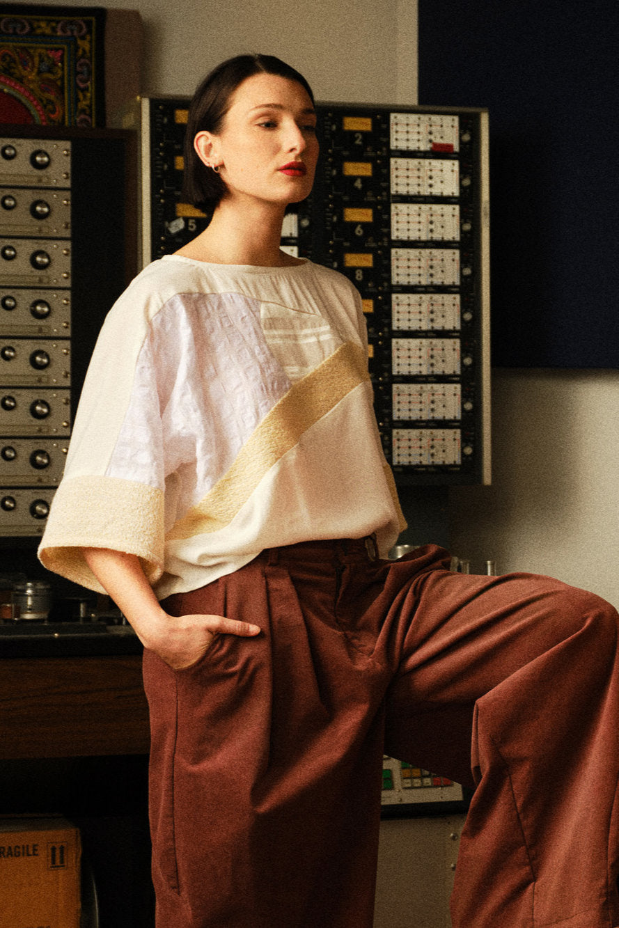 Parce qu'ils aiment les fêtes, ils ont ressenti le besoin de créer ce haut oversize texturé. Le Holda est un vêtement romantique et fluide qui s'accorde avec élégance à tous les bas. Leur sélection de textiles majestueux mise sur de subtils jeux d'ombre et de lumière. Sa coupe chauve-souris et son encolure arrondie allient à la fois classicisme et éclat.