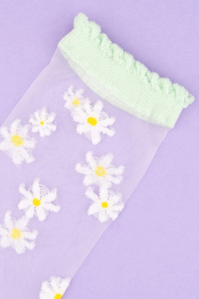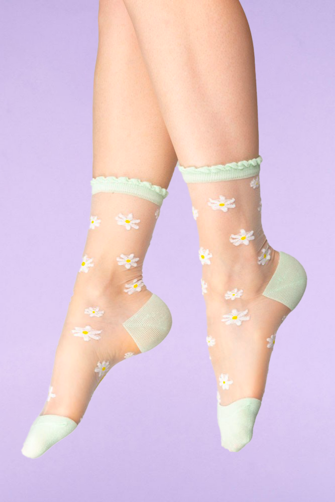 Transparent socks with daisy patterns and pastel green details made in France - One size