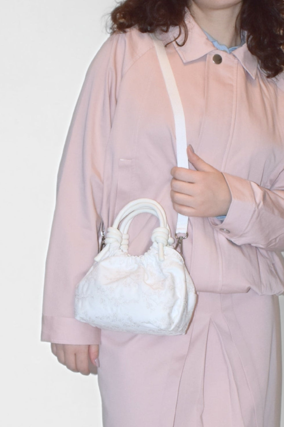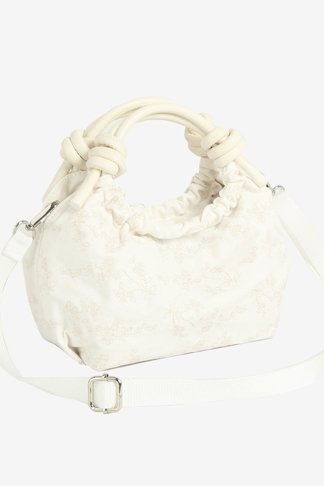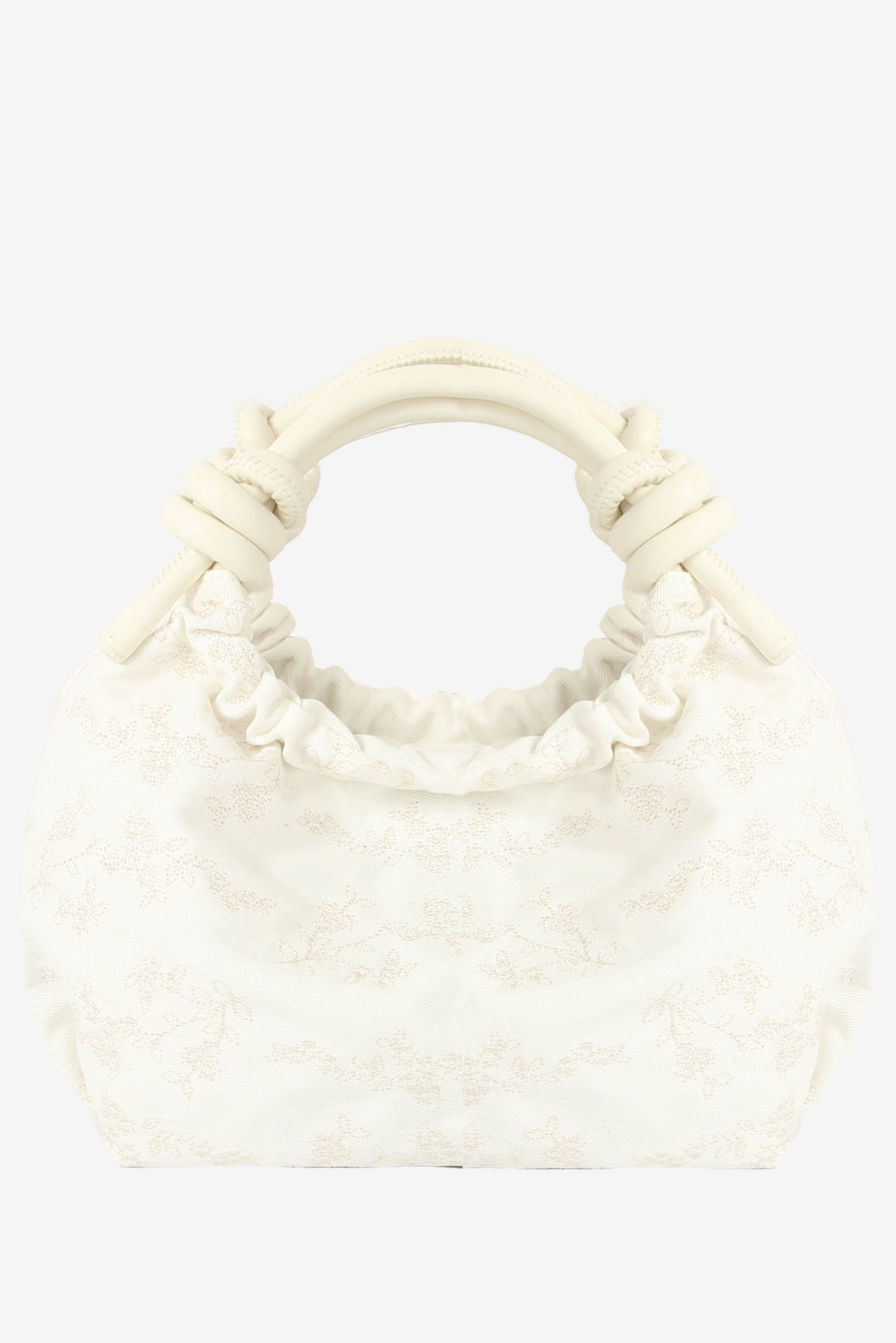 Petit sac à main avec fermeture magnétique et anses ornées de nœuds. Il possède un compartiment principal et une poche intérieure zippée. Dimensions :