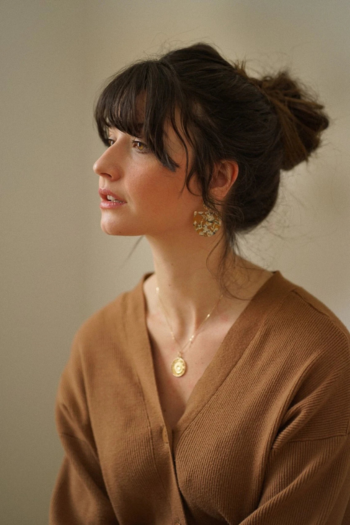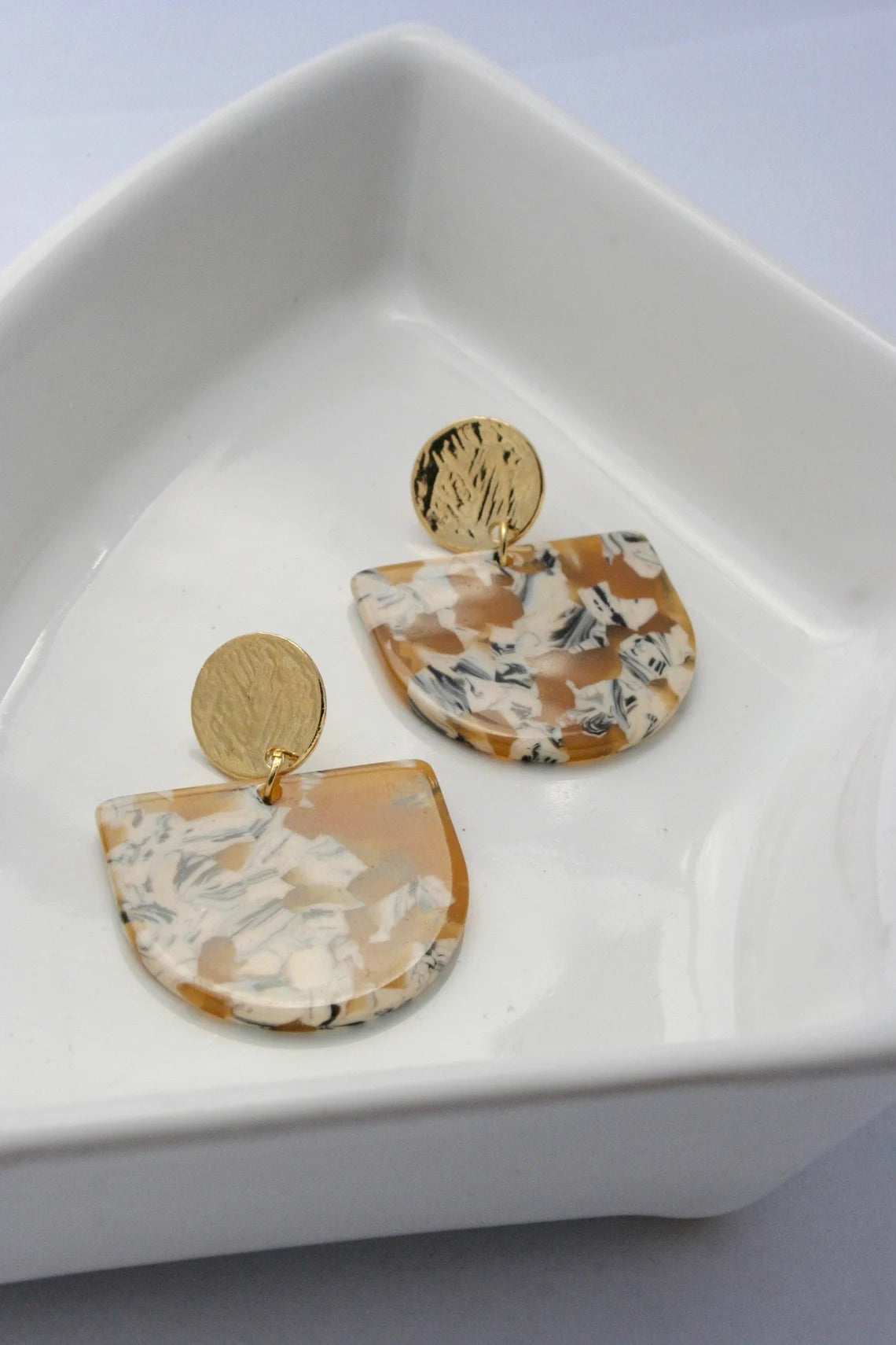 Dangling earrings, hammered gold oval stud with terazzo pattern acrylic pendant