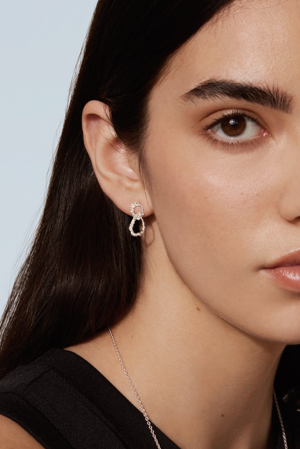 Elegant yet intricate, these drop earrings feature two intertwined circles that make a subtle statement. Their minimalist silhouette offers just the right amount of movement and sparkle, adding a refined touch to any outfit. They're perfect for those who love modern design with a delicate twist.