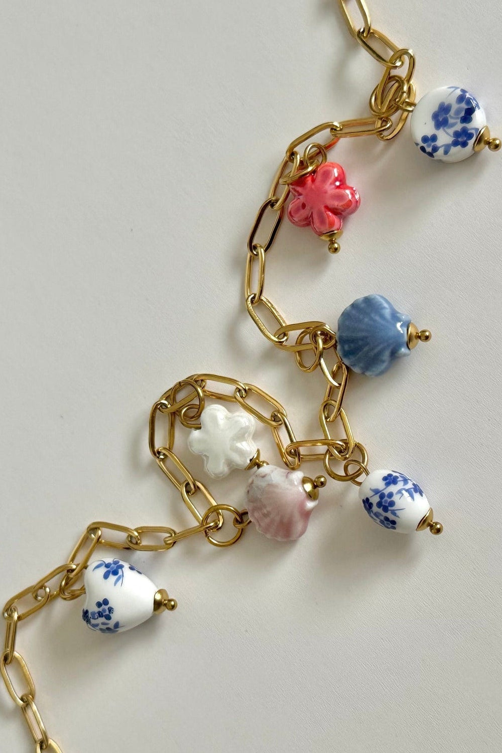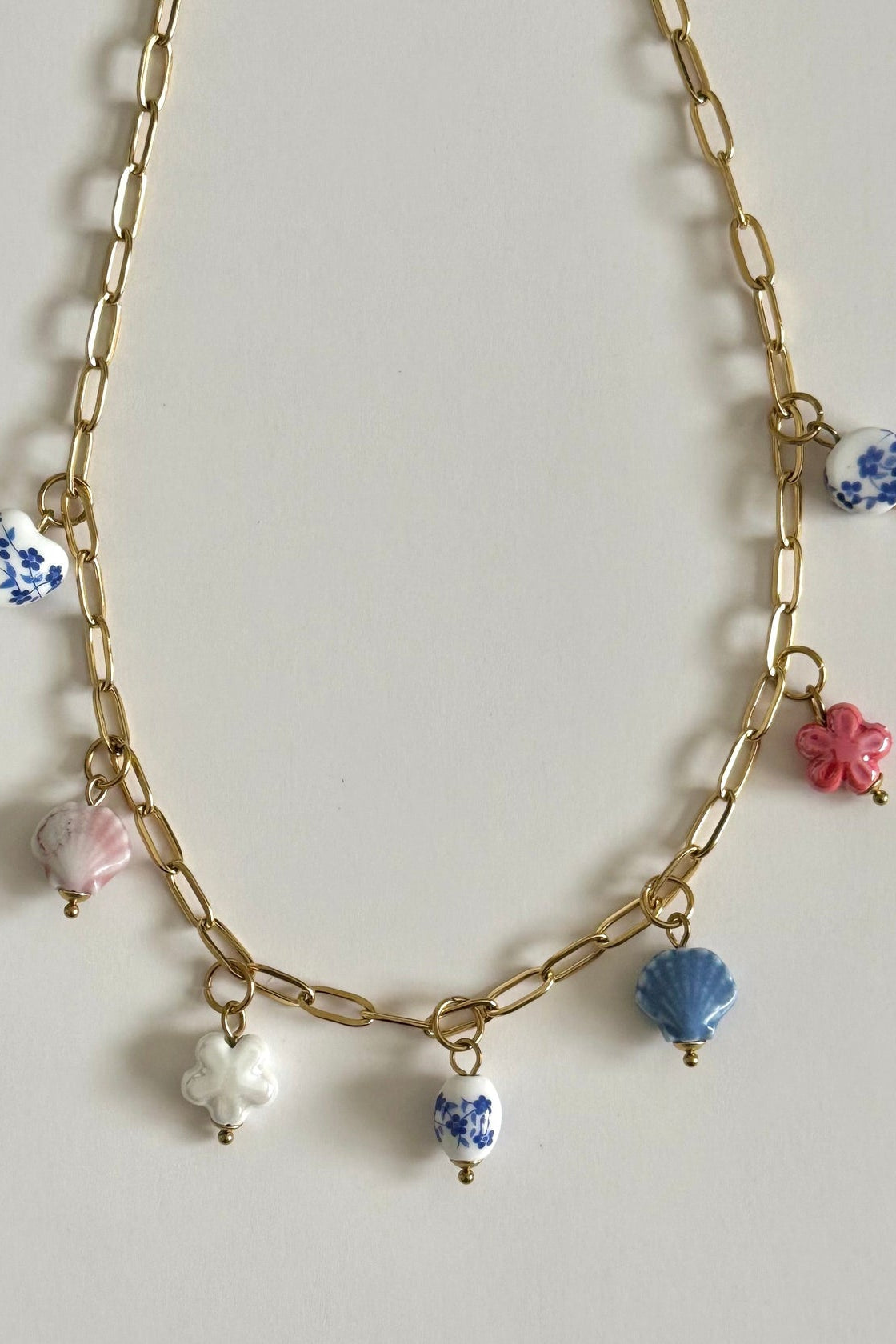 Necklace adorned with seven charming ceramic pendants, adding a touch of whimsy and elegance to any outfit.