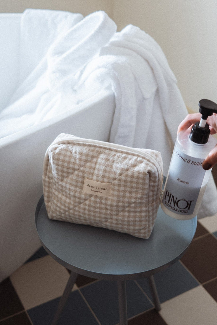 The must-have quilted pouch is now available in a lovely organic gingham fabric.