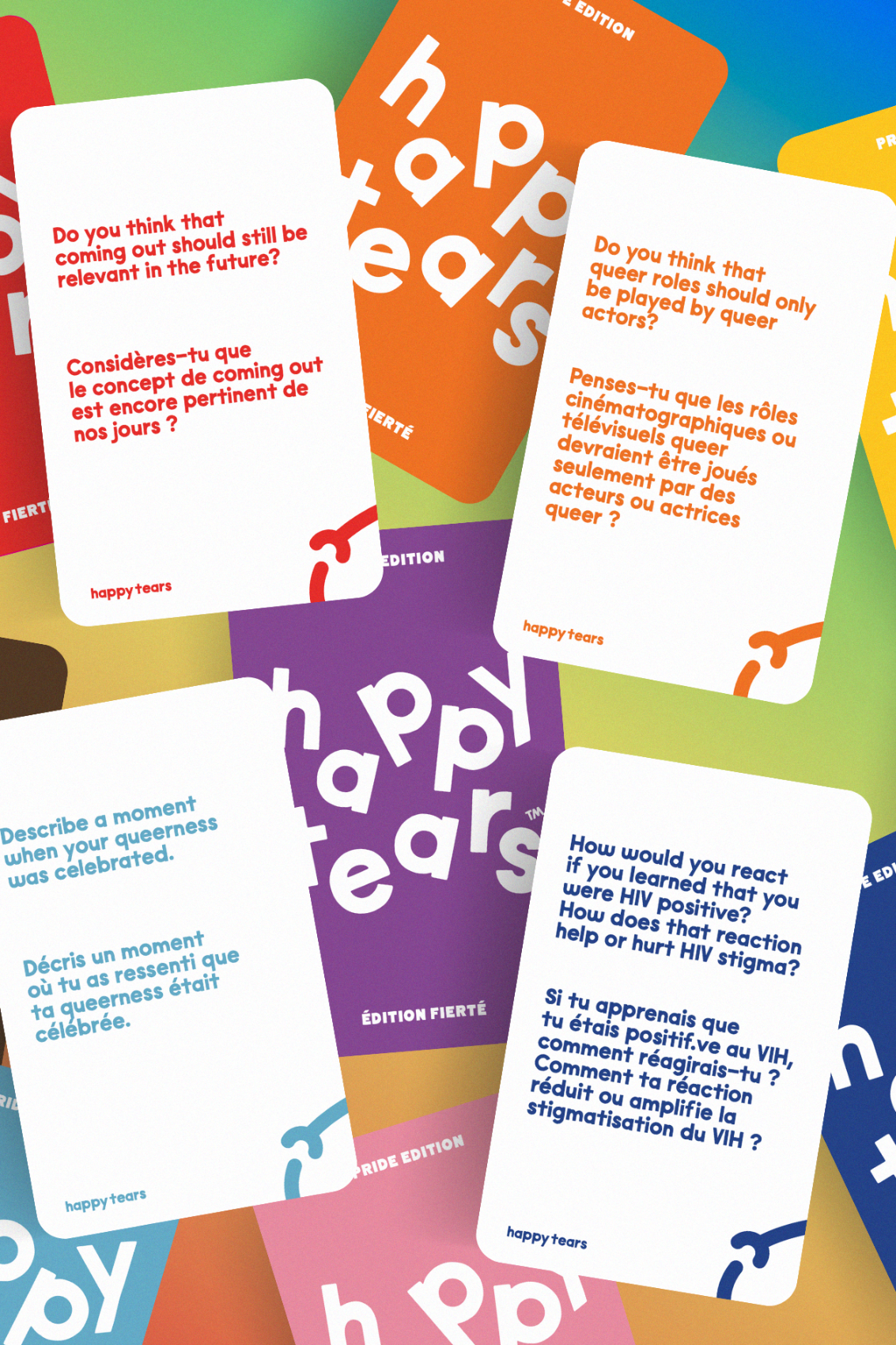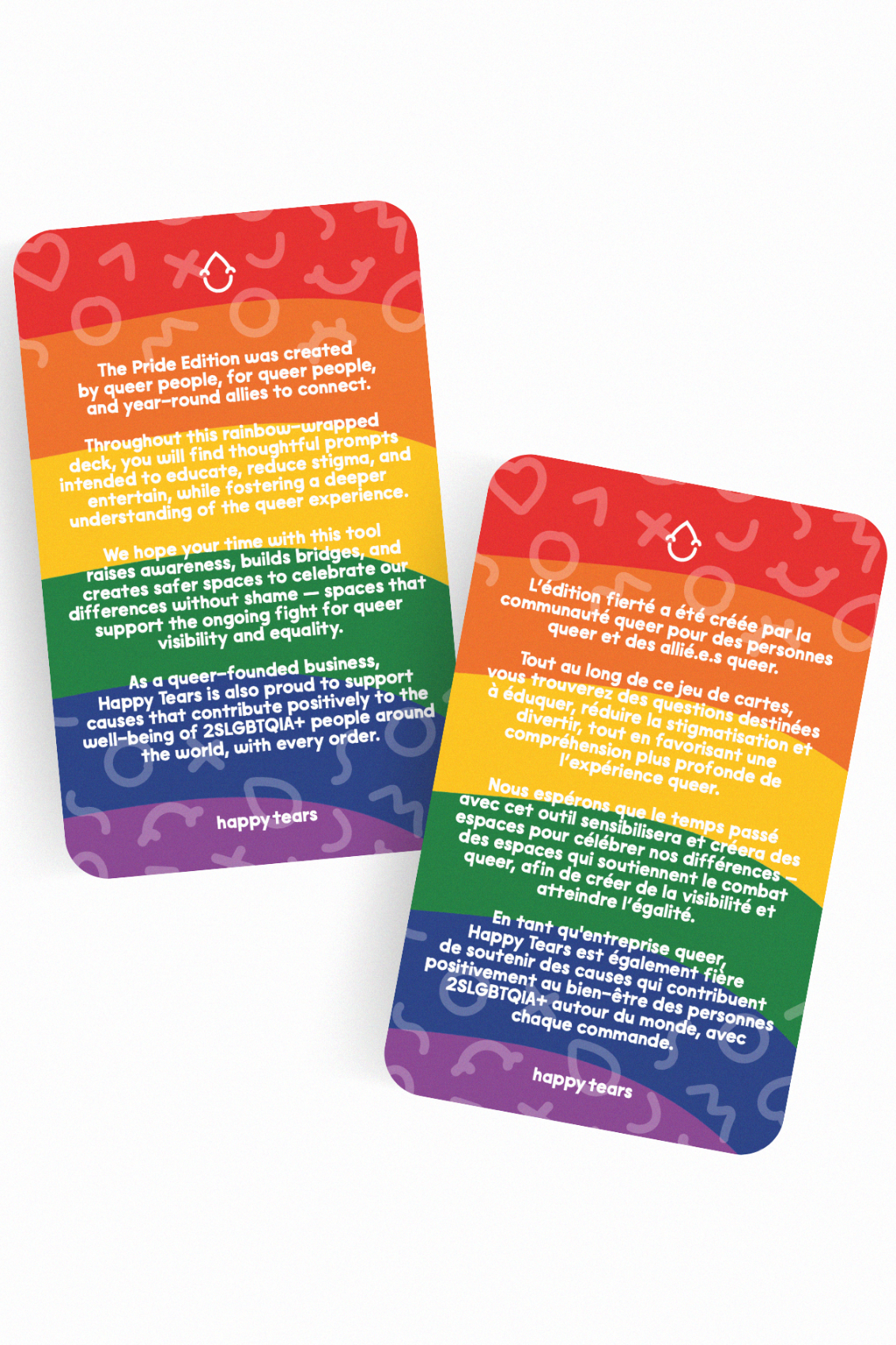 SPECIFICATIONS: 100 bilingual questions on the LGBT+ community, in English and French. The questions can be fun or educational, and can cover light or heavy topics.
