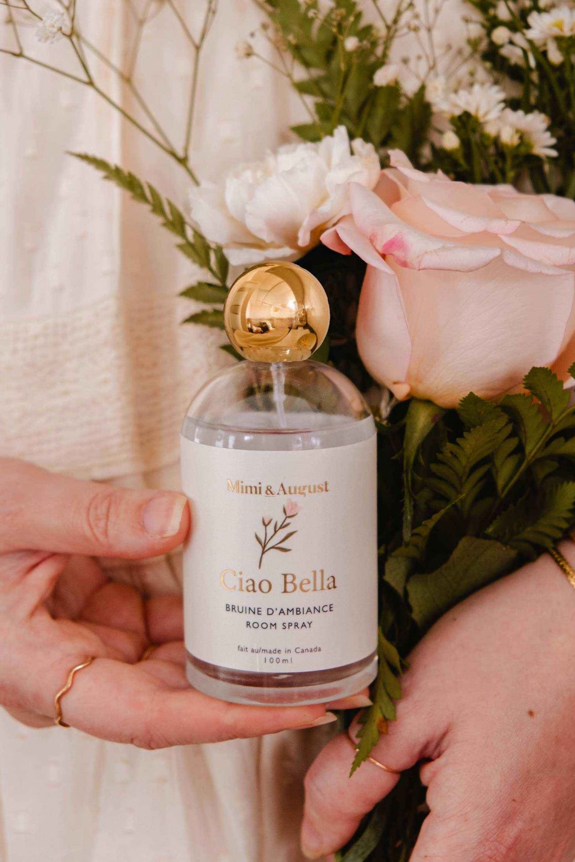 Ciao Bella atmosphere mist 100 ml by MIMI & AUGUST. A delicate blend of jasmine, violet, cedar, and citrus that transforms any space into a soothing refuge. Perfect for the bedroom, bathroom, or living room, this floral and woody scent creates an elegant and welcoming atmosphere every day.