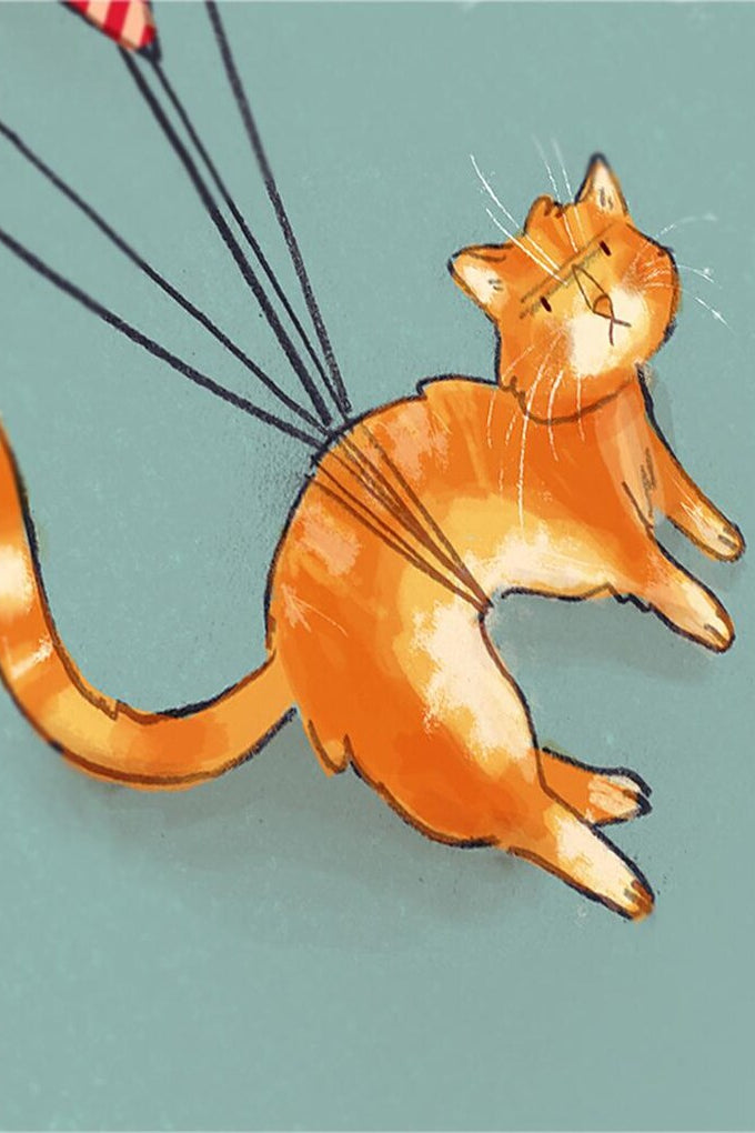 VALERIE BOIVIN Carte de Souhait - Chat accroché à des ballons