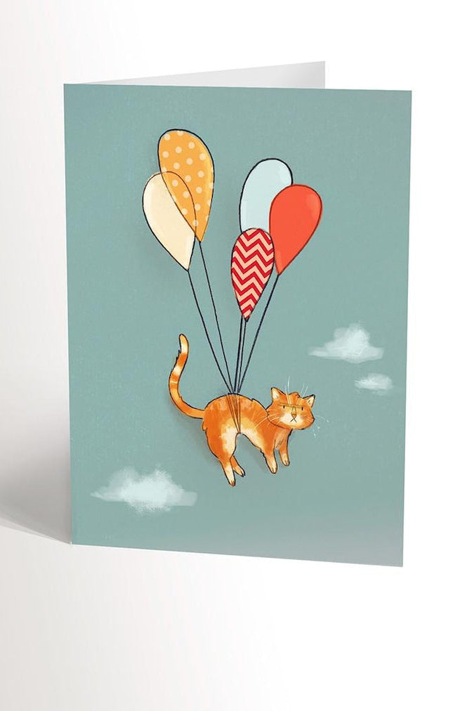 Carte de souhait, avec un chat ronchon accroché à des ballons!