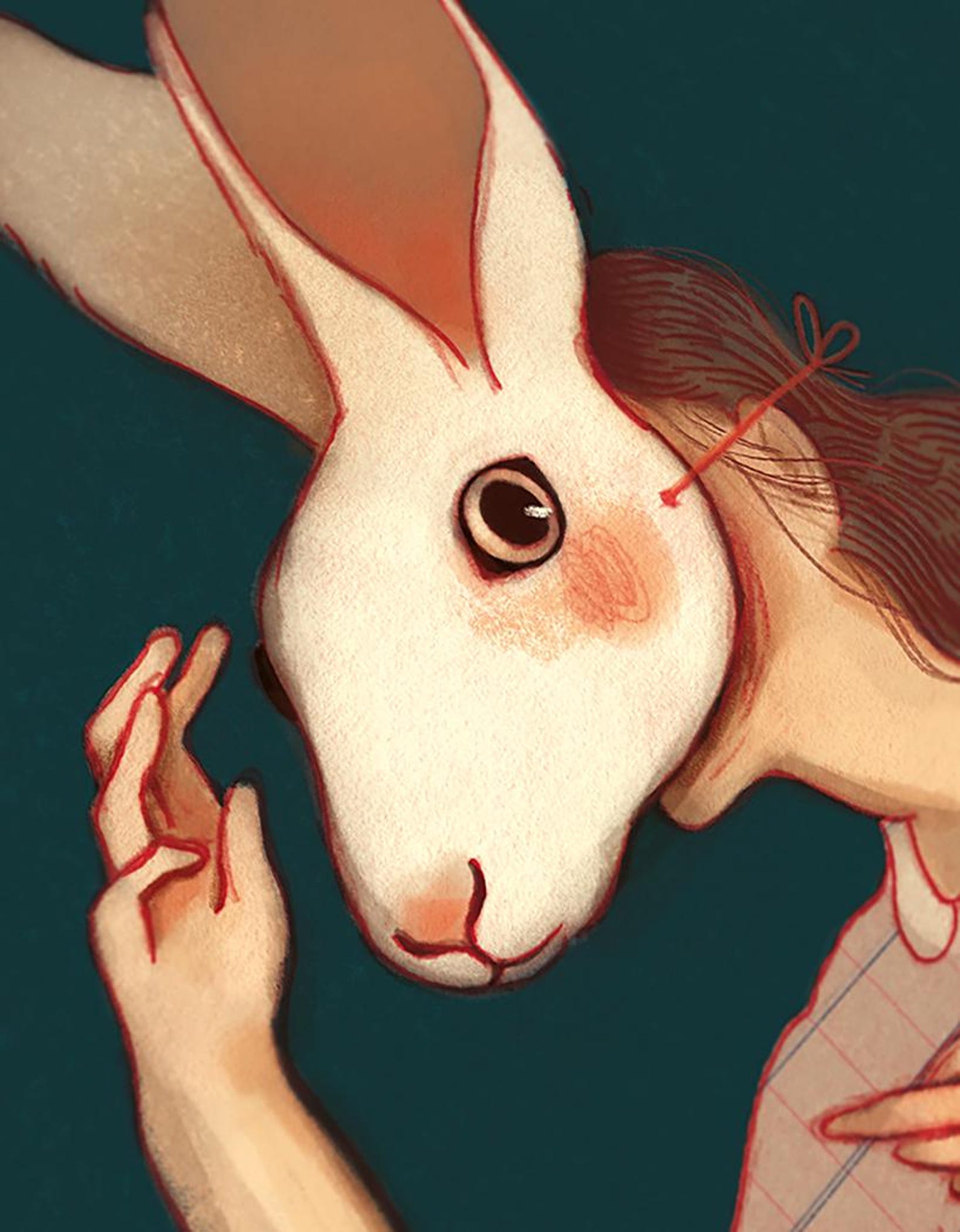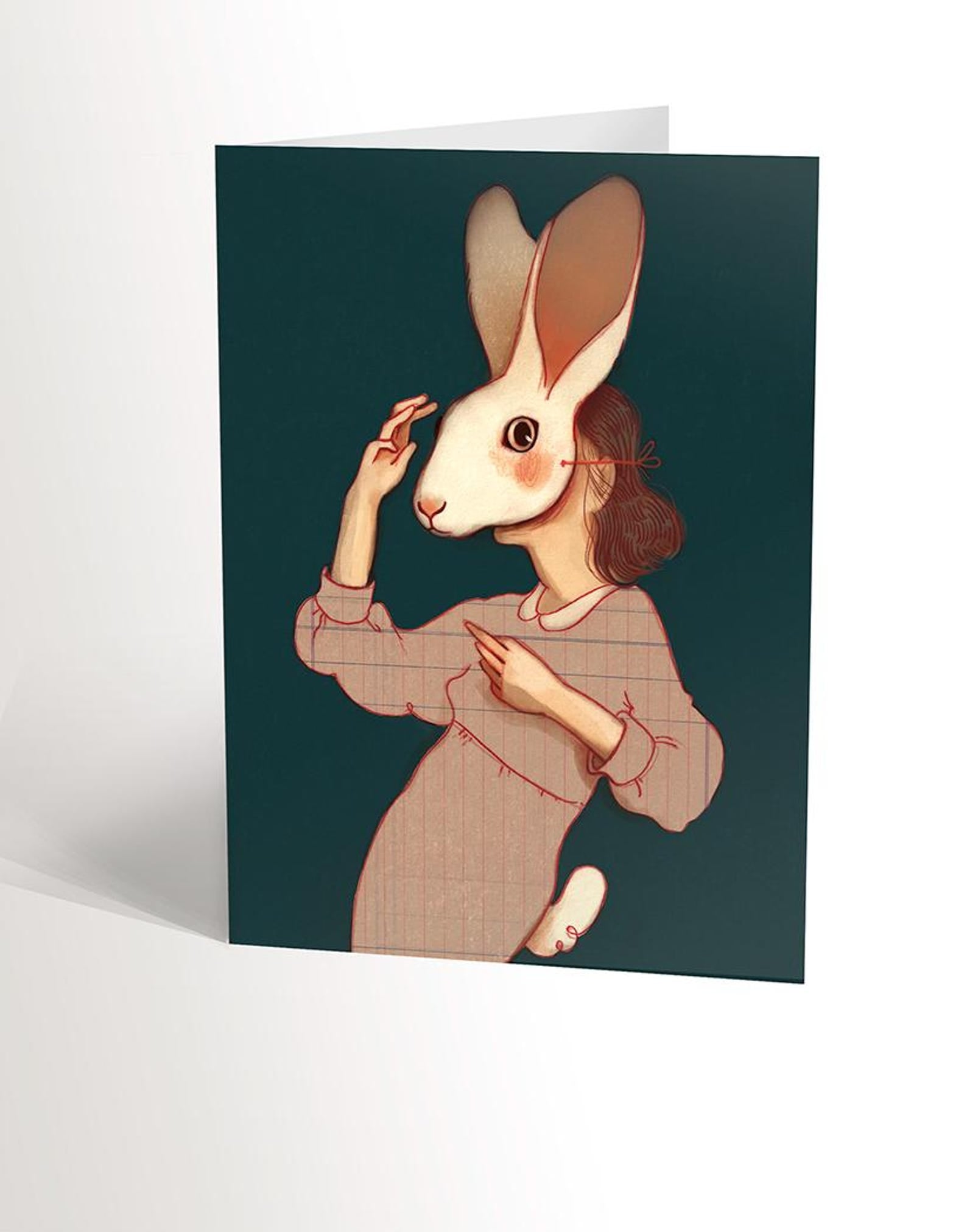 A greeting card, without text, depicting a woman with a rabbit mask!