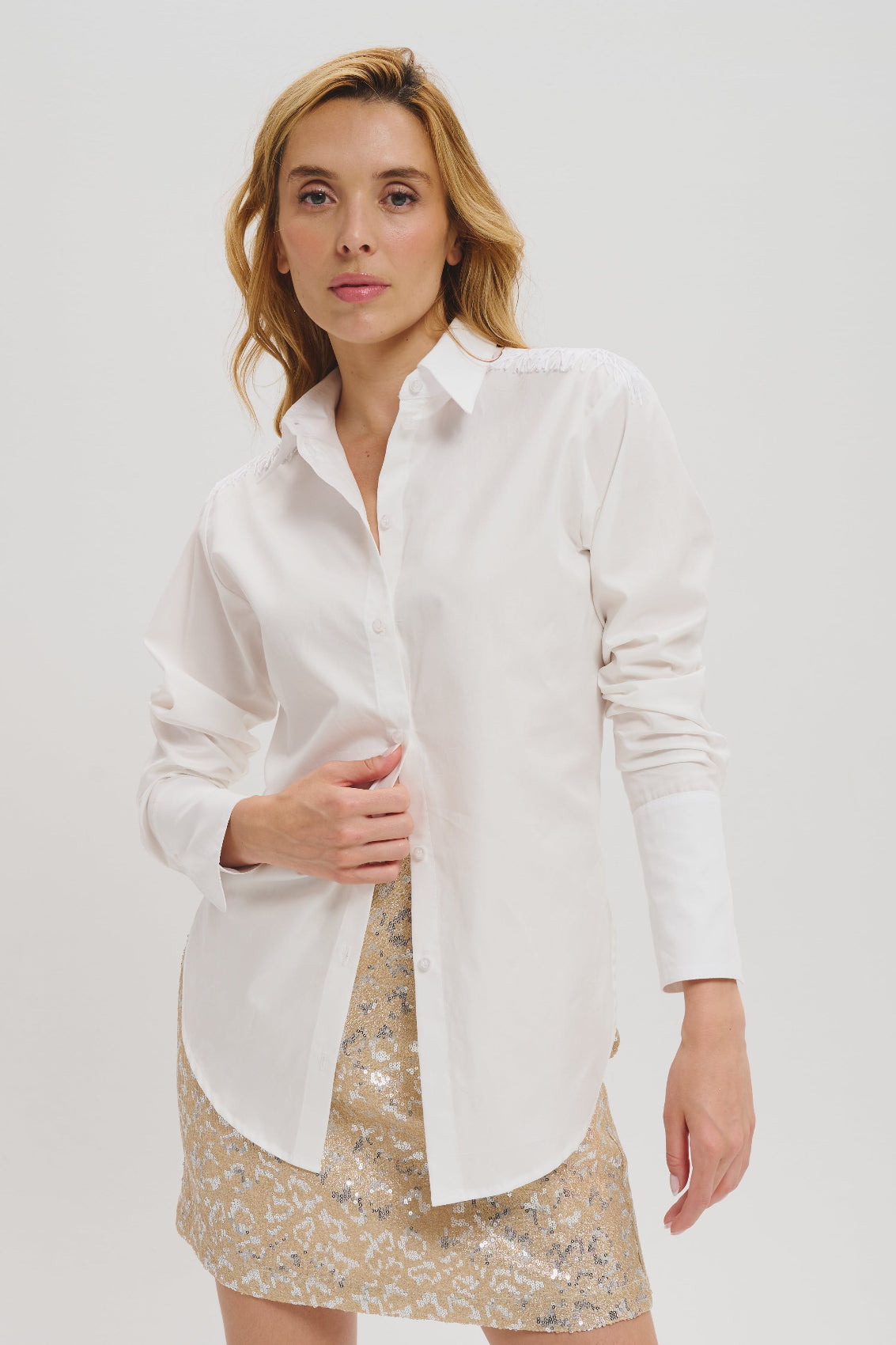 Confectionnée dans un mélange de coton doux et léger, cette chemise se distingue petite franges et sa coupe impeccable. Sa silhouette structurée et élégante offre une grande liberté de mouvement, du matin au soir.