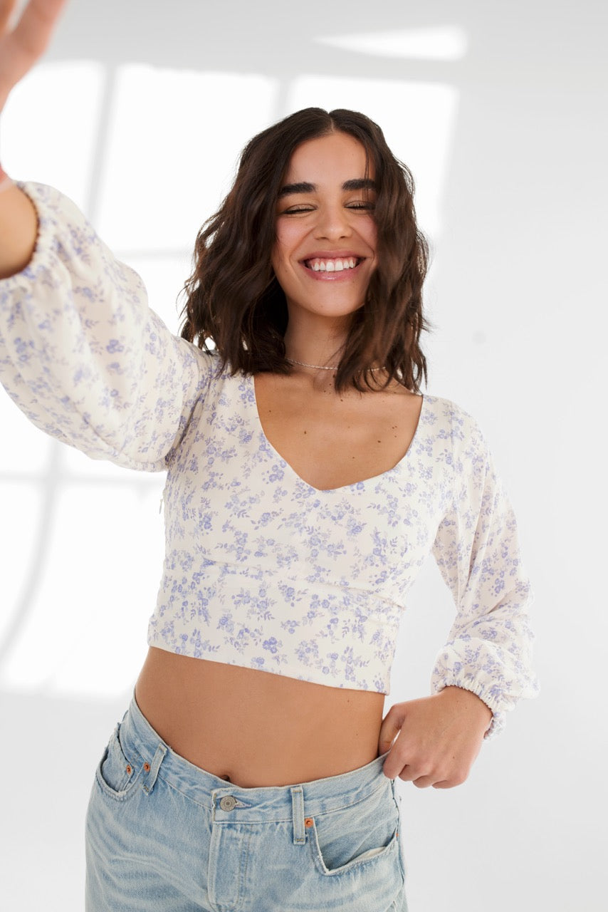 The cup: A short blouse with a V-neck, slightly puffed sleeves, and a more fitted waist, offering a touch of femininity and lightness. Available in a blue and white floral print, perfect for spring!