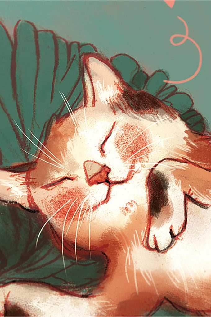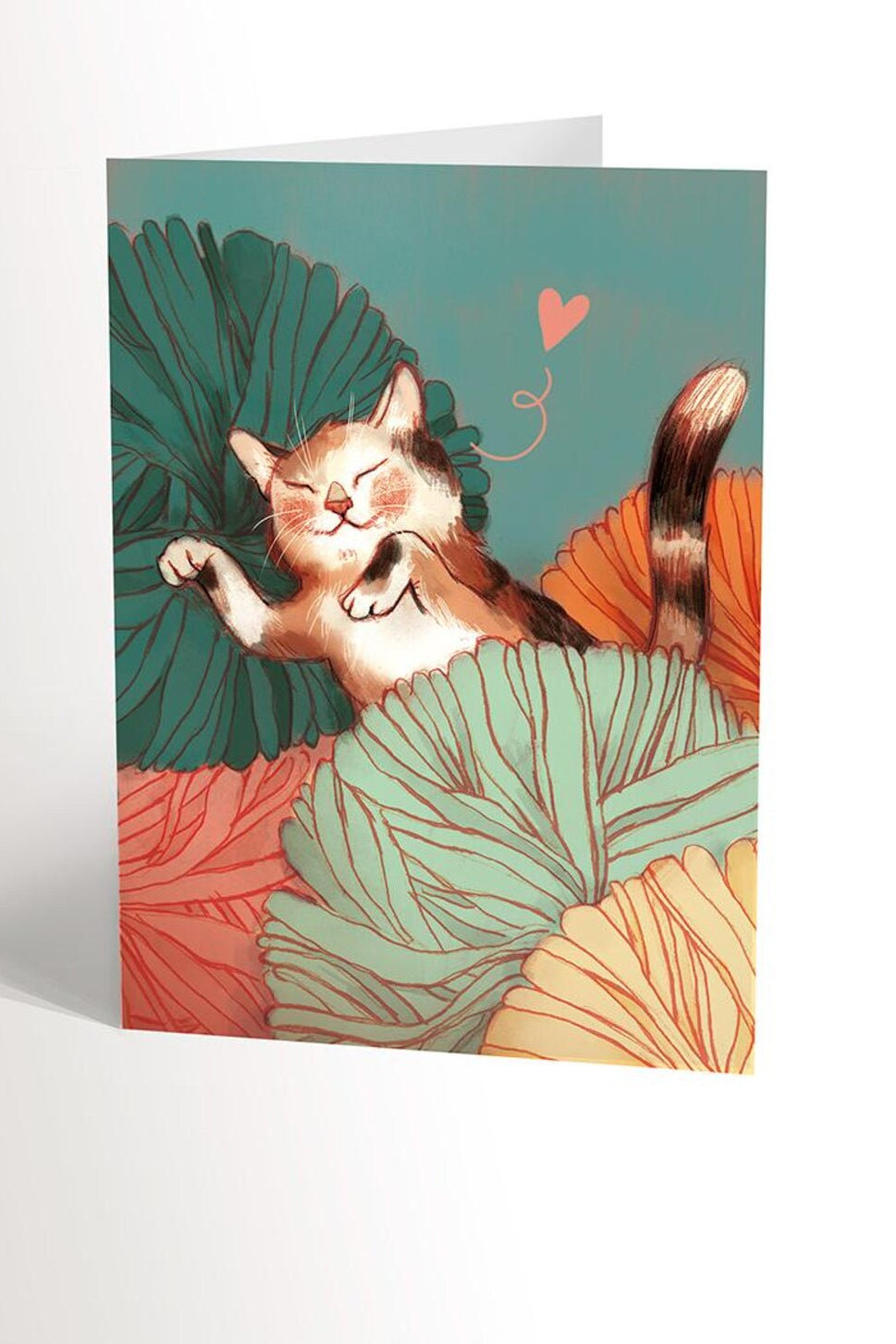 Carte de souhait, avec un chat qui joue dans des balles de laine!