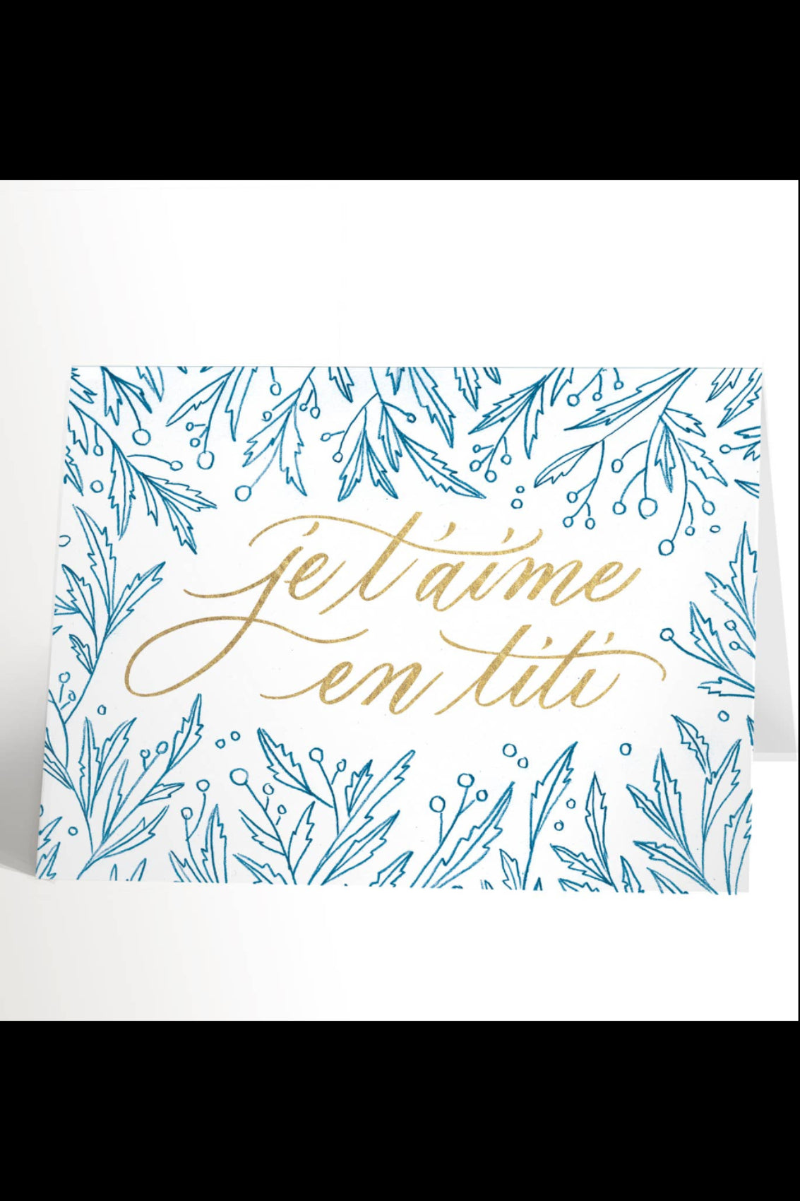 Carte de souhait, avec écrit ''Je t'aime en titi'' sur fond blanc avec bordure végétale!